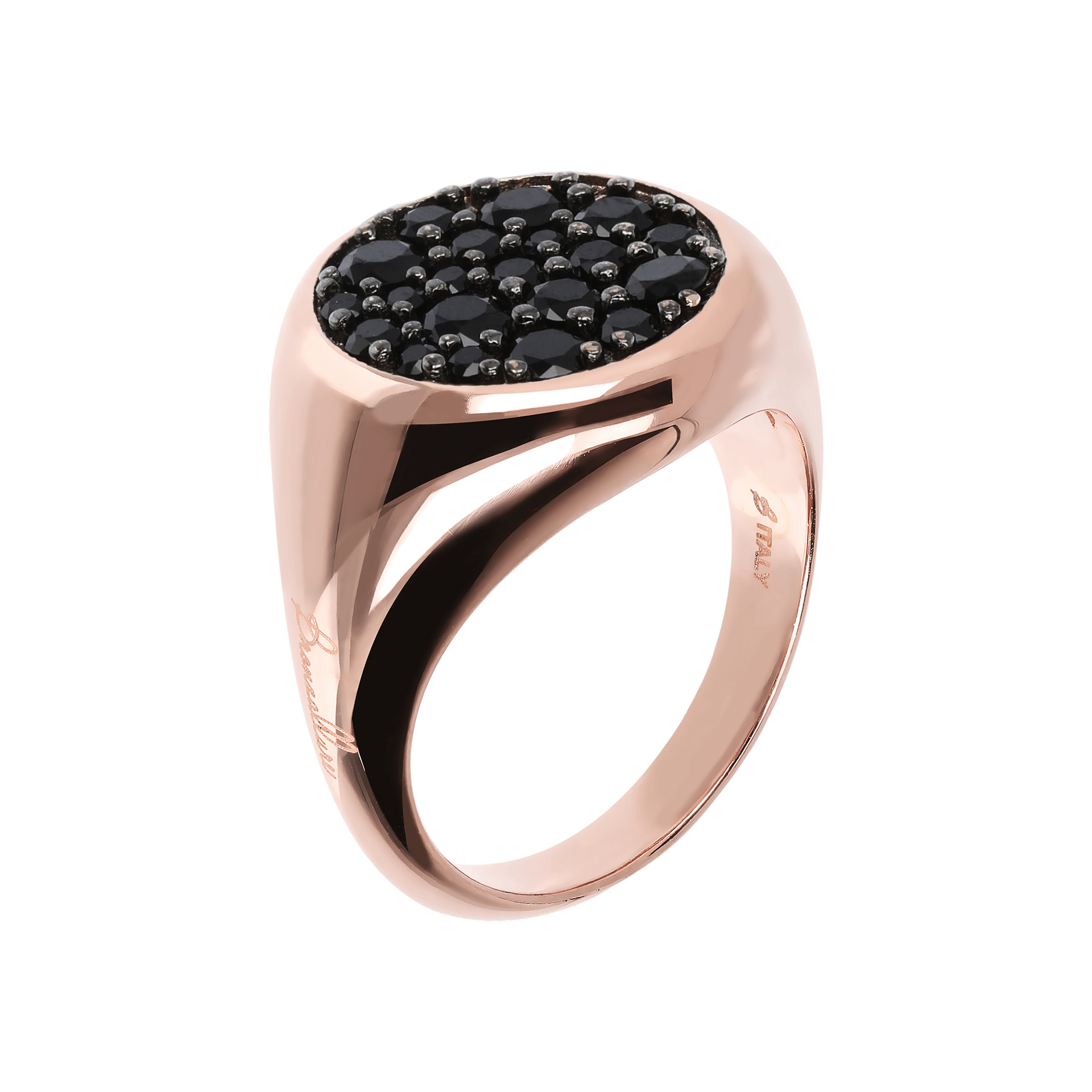 Anello chevalier Bronzallure realizzato in lega Golden Rosè, placcato oro rosa 18kt, con elemento tondo nella parte superiore (1.5 cm) in pavè di spinello nero o cubic zirconia, qualità luminosa. Creazione...