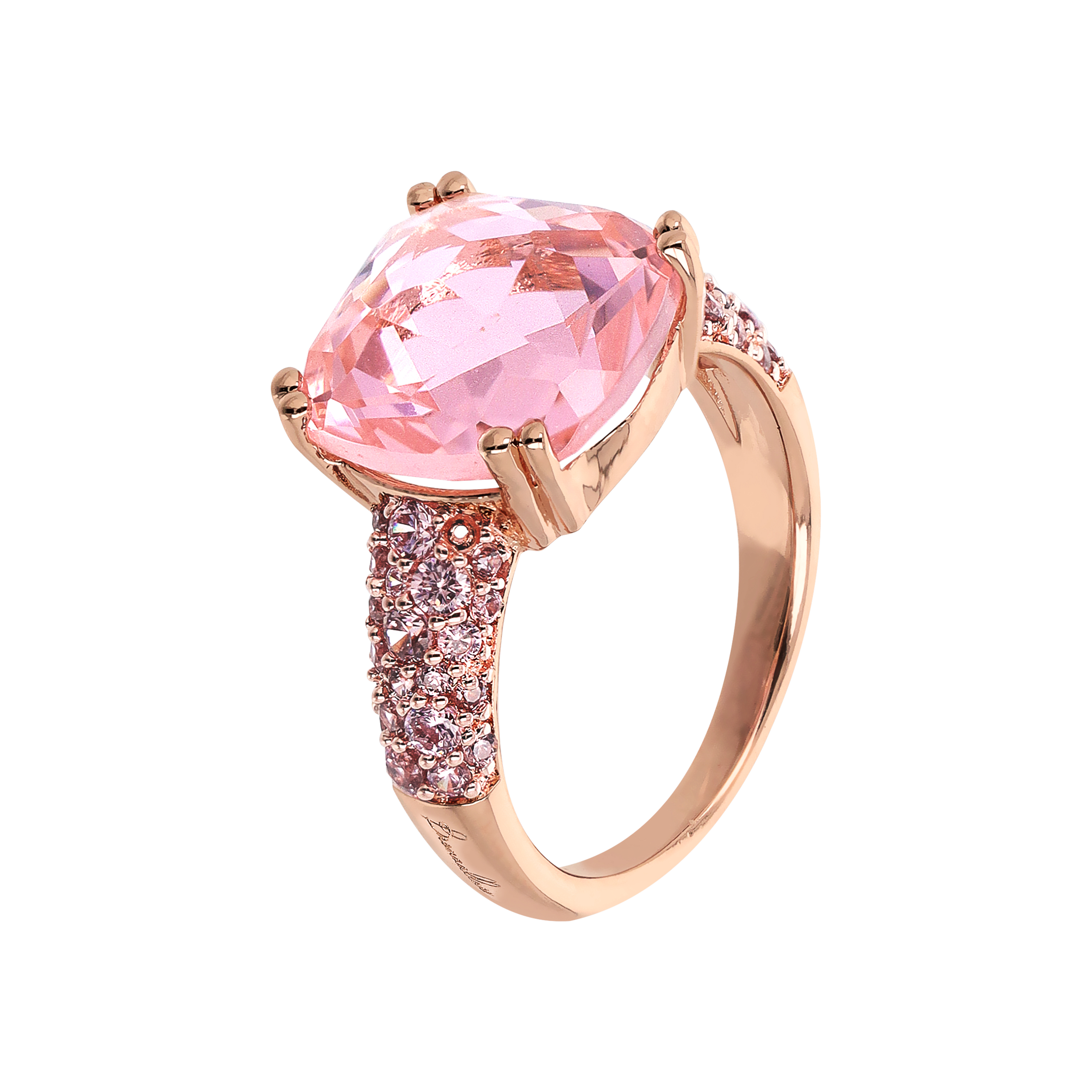 Anello cocktail Bronzallure realizzato su base Golden Rosè, placcata oro rosa 18kt, impreziosito da una pietra centrale prisma gem dalla forma quadrata (12x12 mm). Ai lati della pietra sono posizionate delle cubic zirconia che creano un pavè luminoso.
