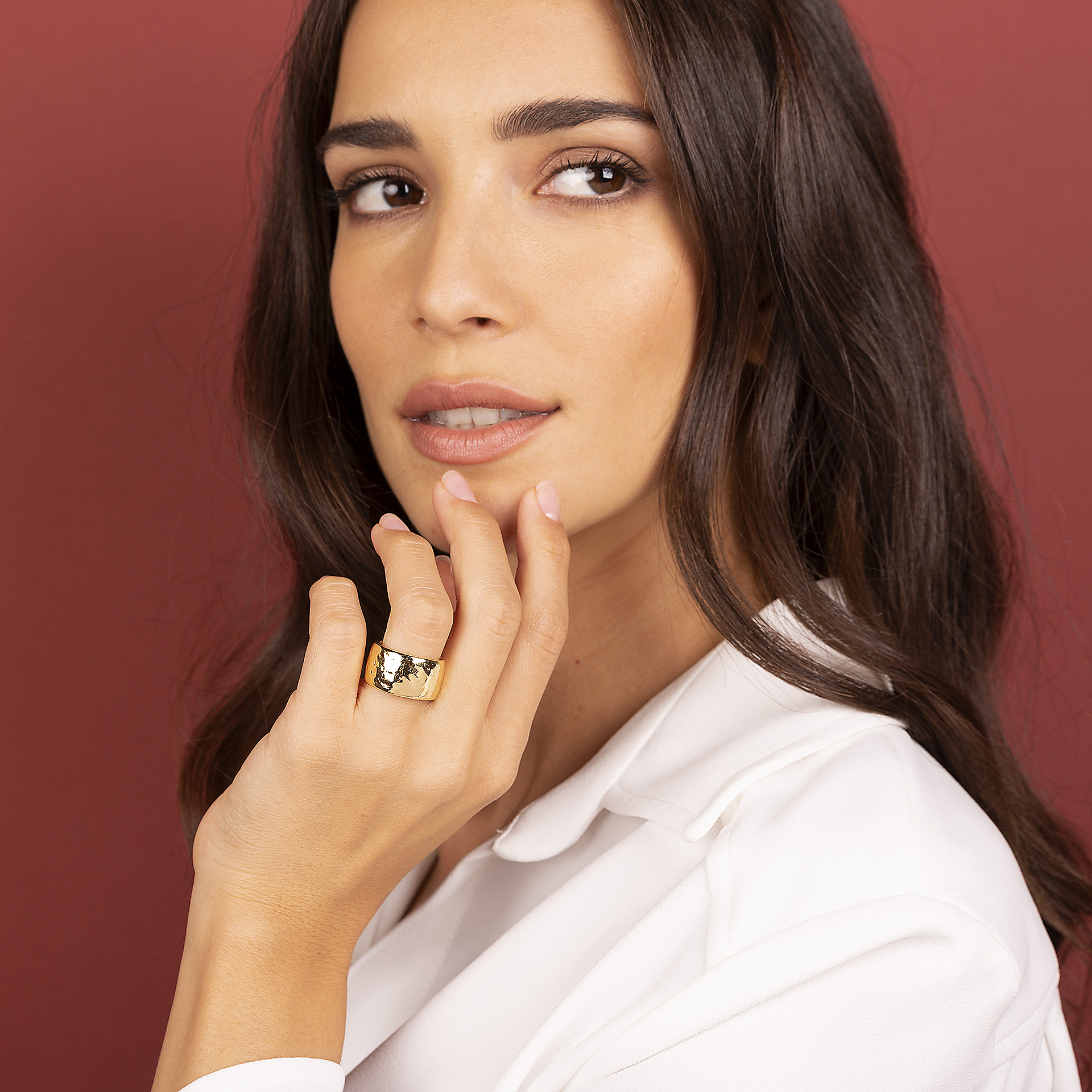 Anello a fascia bombato Etrusca Gioielli montato su base Golden, placcata oro giallo 18kt, dalla superficie martellata.