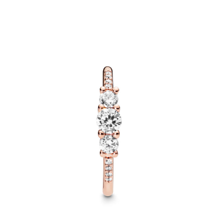 Tre grandi pietre di zirconia cubica incolore donano eleganza a questo anello in Pandora Rose, ulteriormente impreziosito da piccole pietre sul gambo. Il design e colore delicato creano un gioiello vintage e senza tempo.