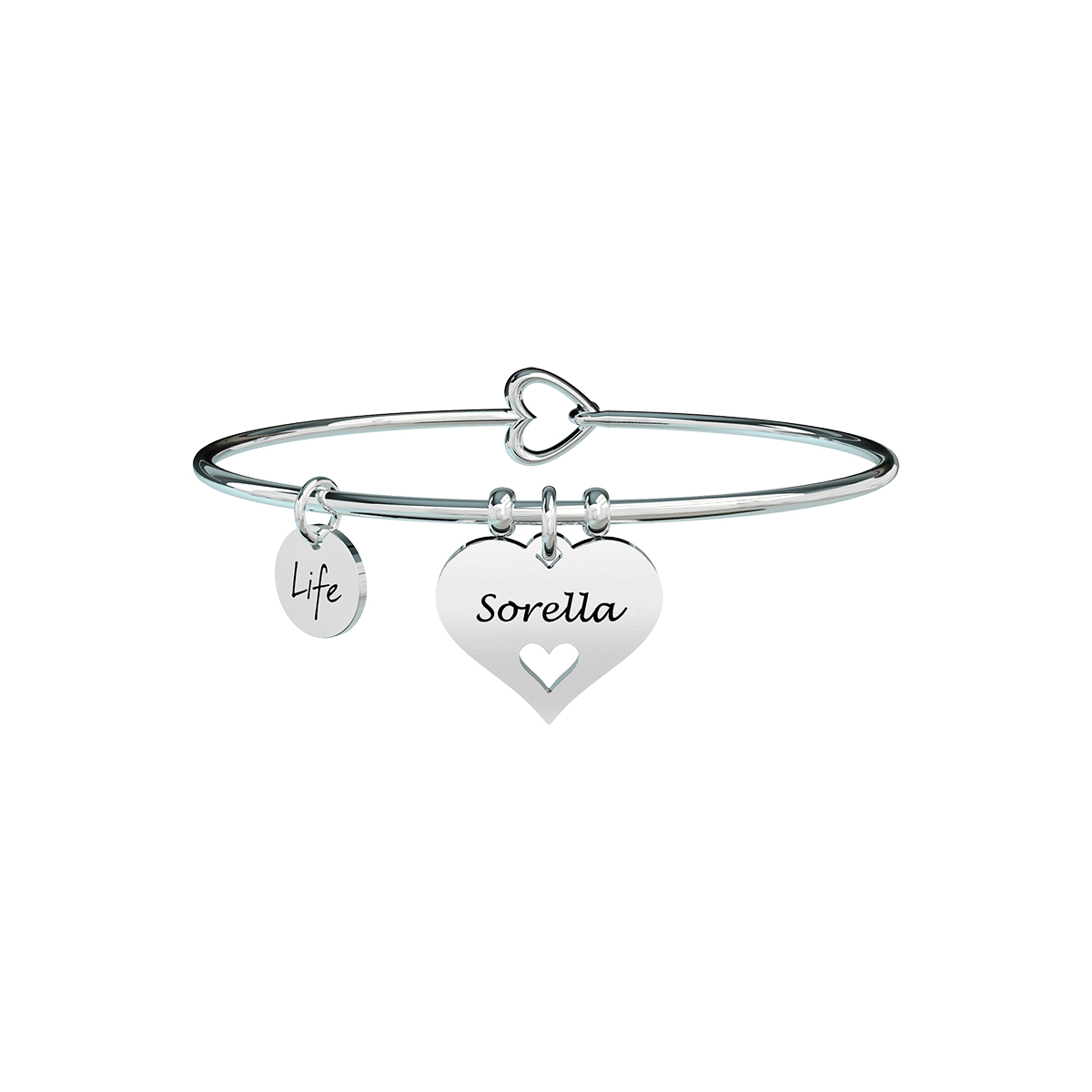 KIDULT - SORELLA - FAMILY - 731626 Bracciale bangle in acciaio 316L, circonferenza 20 cm, diametro 6 cm con ciondolo smaltato cuore 15x18 mm. Scritta: "Sorella".