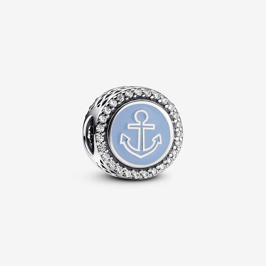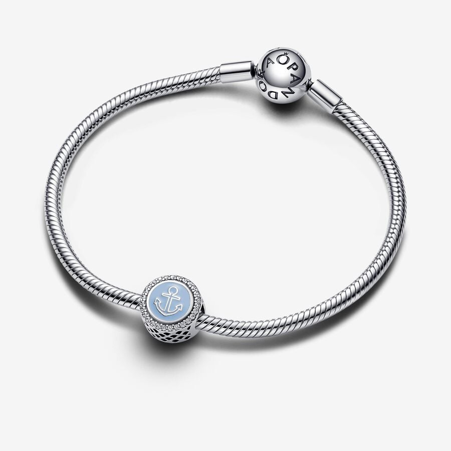 Abbraccia lo spirito del mare con il Charm Ancora. Realizzato in Argento Sterling 925, questo intricato charm rotondo dal design a bottone presenta il messaggio "HOME is where the SEA is" (CASA è dove si trova il MARE) inciso su un lato. L'altro lato presenta linee in rilievo che formano la sagoma di un'ancora. Decorato da 54 pietre di zirconia cubica incolore e smalto blu pastello applicato a mano, il charm presenta forme di rombo ritagliate sui lati. Abbinalo a una collana in Argento Sterling 925 o a un bracciale per un look di ispirazione marittima che riflette il tuo amore per l'oceano, oppure regalalo a qualcuno che al mare si sente come a casa.