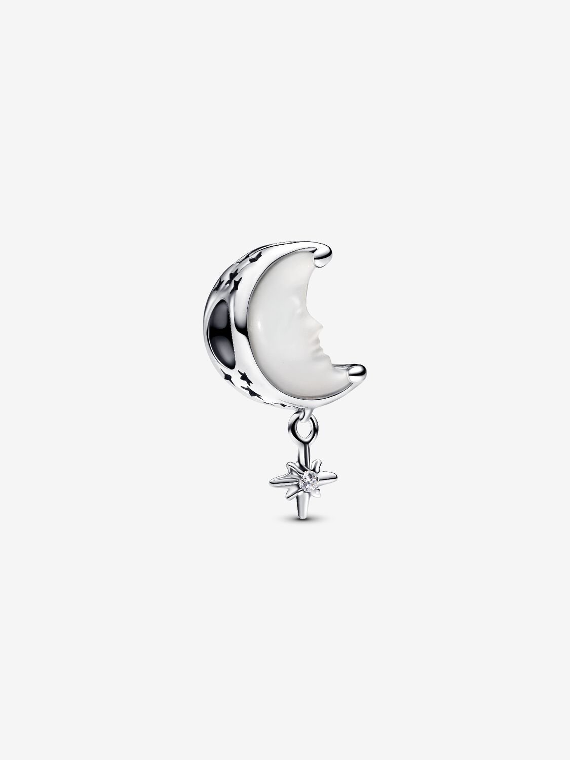 Questo charm presenta una luna in madreperla creata dall'uomo in bioresina con raffigurati i dettagli del viso e una stella polare pendente. Un simbolo di guida e luce nelle notti più scure. Indossalo sul tuo bracciale e lascia che il cielo notturno sia la tua guida.