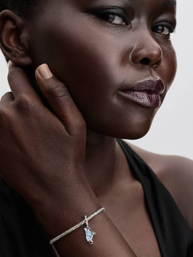 Realizza i tuoi sogni con il charm pendente con ali in Argento Sterling 925. La testa e il corpo della farfalla formano una chiave. Un'ala ha un design openwork, mentre l'altra presenta smalto scintillante e il messaggio inciso "UNLOCK TOMORROW".