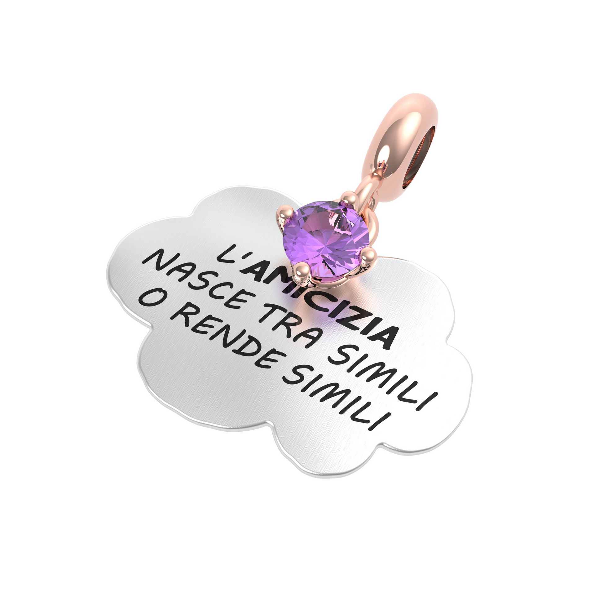 CHARM RERUM "L'AMICIZIA NASCE TRA SIMILI O RENDE SIMILI" - AMICIZIA - 25029 Tutti i gioielli RERUM sono realizzati con materiali ipoallergenici in argento 925, placcati in oro rosa 18kt con pietre naturali e perle. Famiglia: Quarzo Durezza: 7 Indice rifrazione: 1.55 Taglio: Brillante Pietra: Ametista