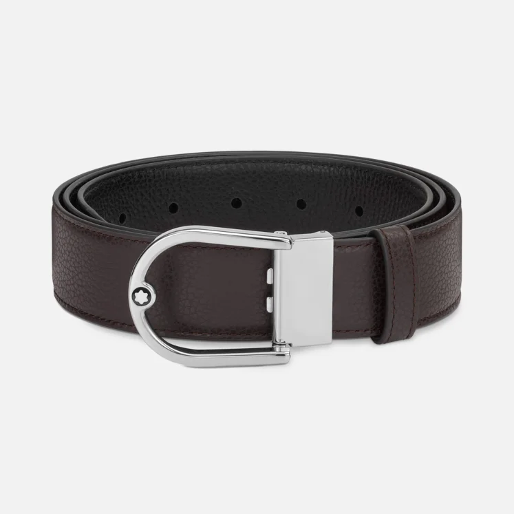 Color ebano da un lato e nera dall’altro, questa cintura reversibile da 35 mm offre due opzioni di stile ed è realizzata in pregiata pelle granulata. La fibbia a ferro di cavallo finitura palladio aggiunge un tocco intramontabile alla cintura, completata dall’emblema Montblanc.