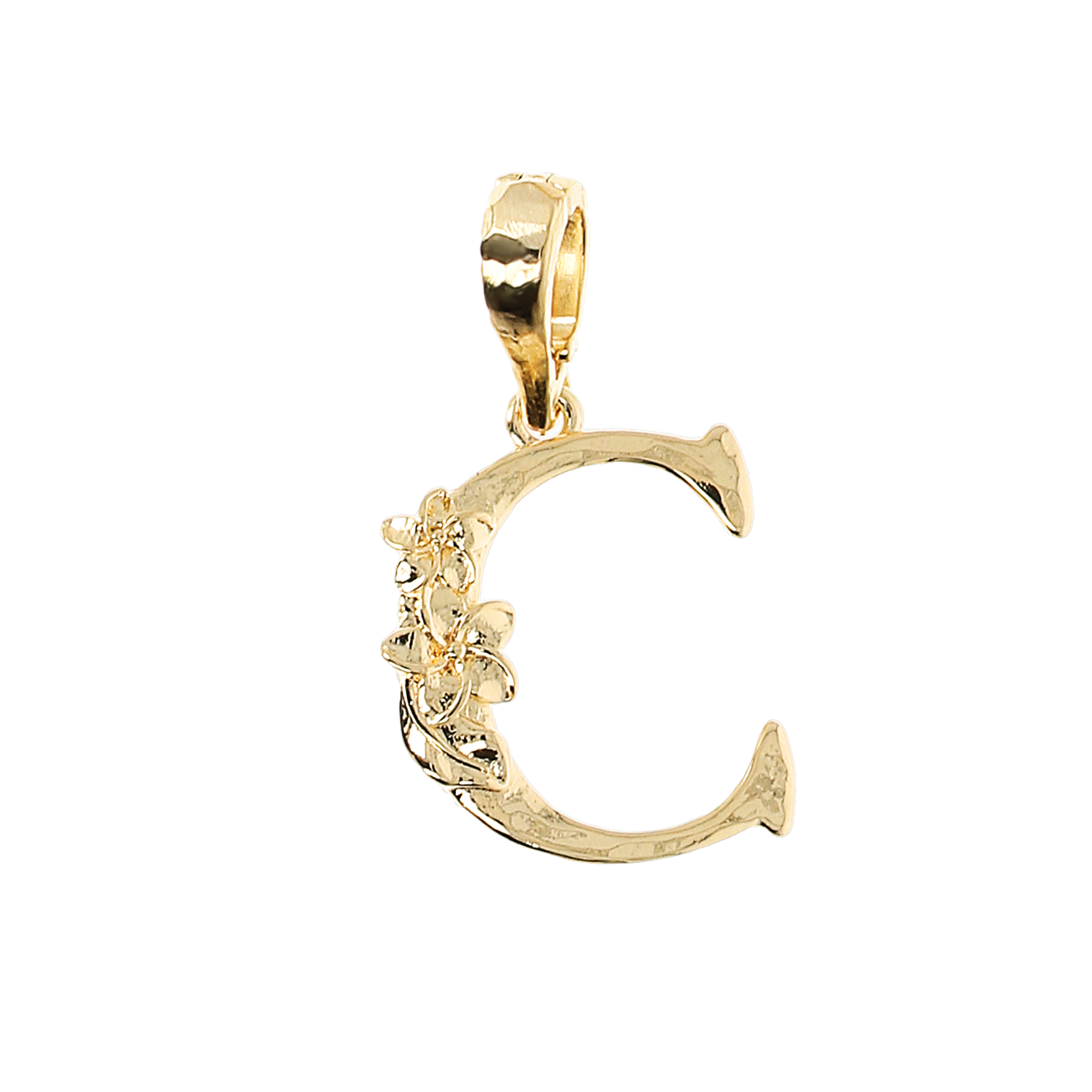 Ciondolo iniziale Etrusca Gioielli montato su base Golden, placcata oro giallo 18kt, con superficie martellata ed elemento floreale decorativo