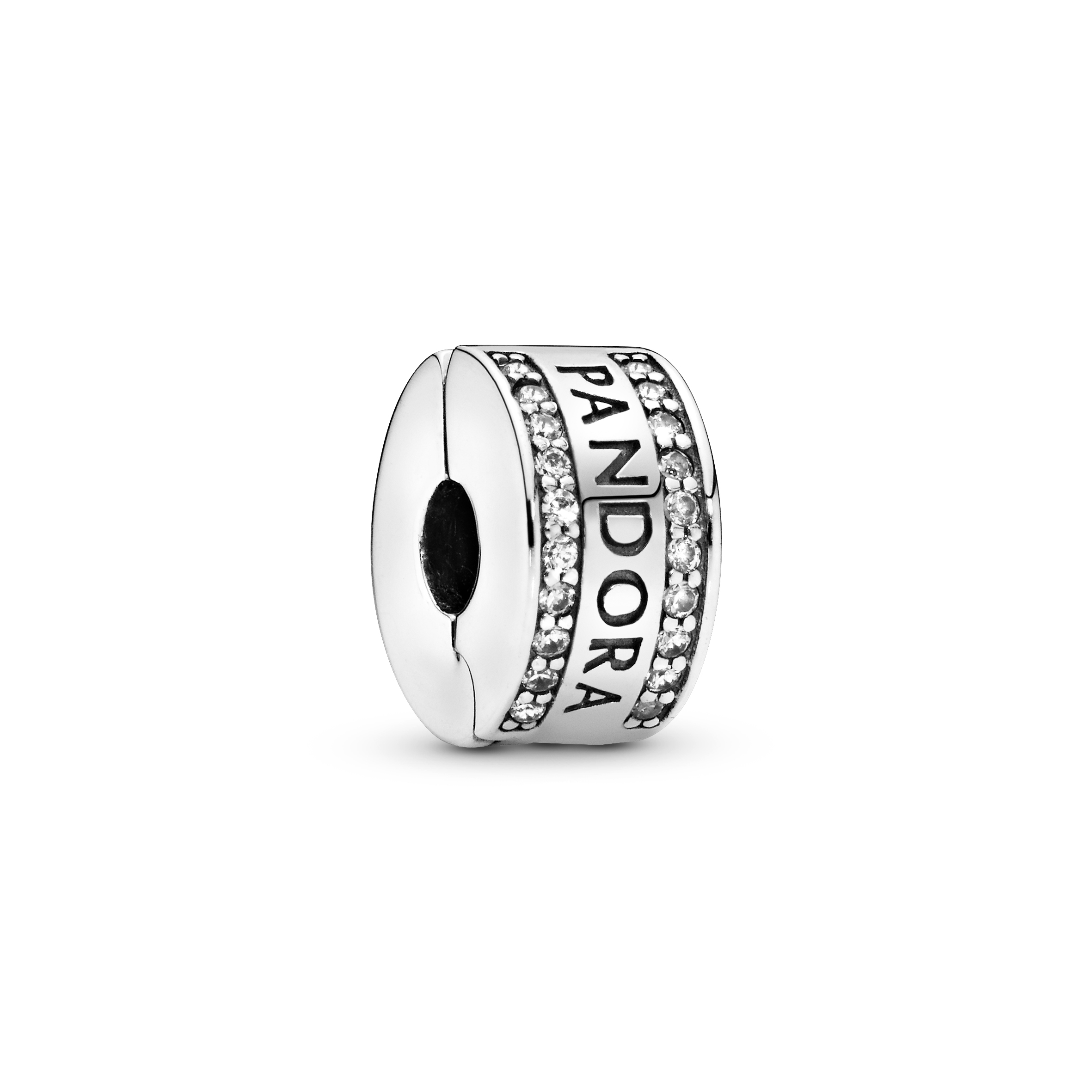 Due file di pietre scintillanti, il logo PANDORA e un inserto in silicone rendono questa clip in Argento Sterling 925 un elemento indispensabile su per tutti i bracciali!