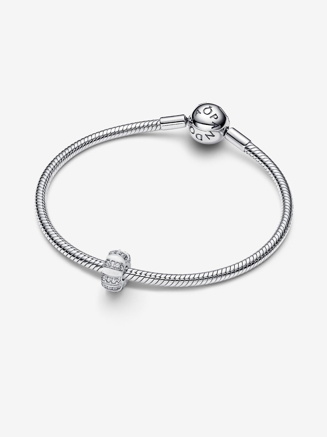 Crea un look che risplende con la clip Eleganza Luminosa in Argento Sterling 925. File alternate di pietre e smalto bianco luminoso simboleggiano forza e bellezza interiore. Grazie all'inserto in silicone, non si inserisce sulle filettature (i divisori in rilievo), ma resta ferma in posizione sul bracciale.