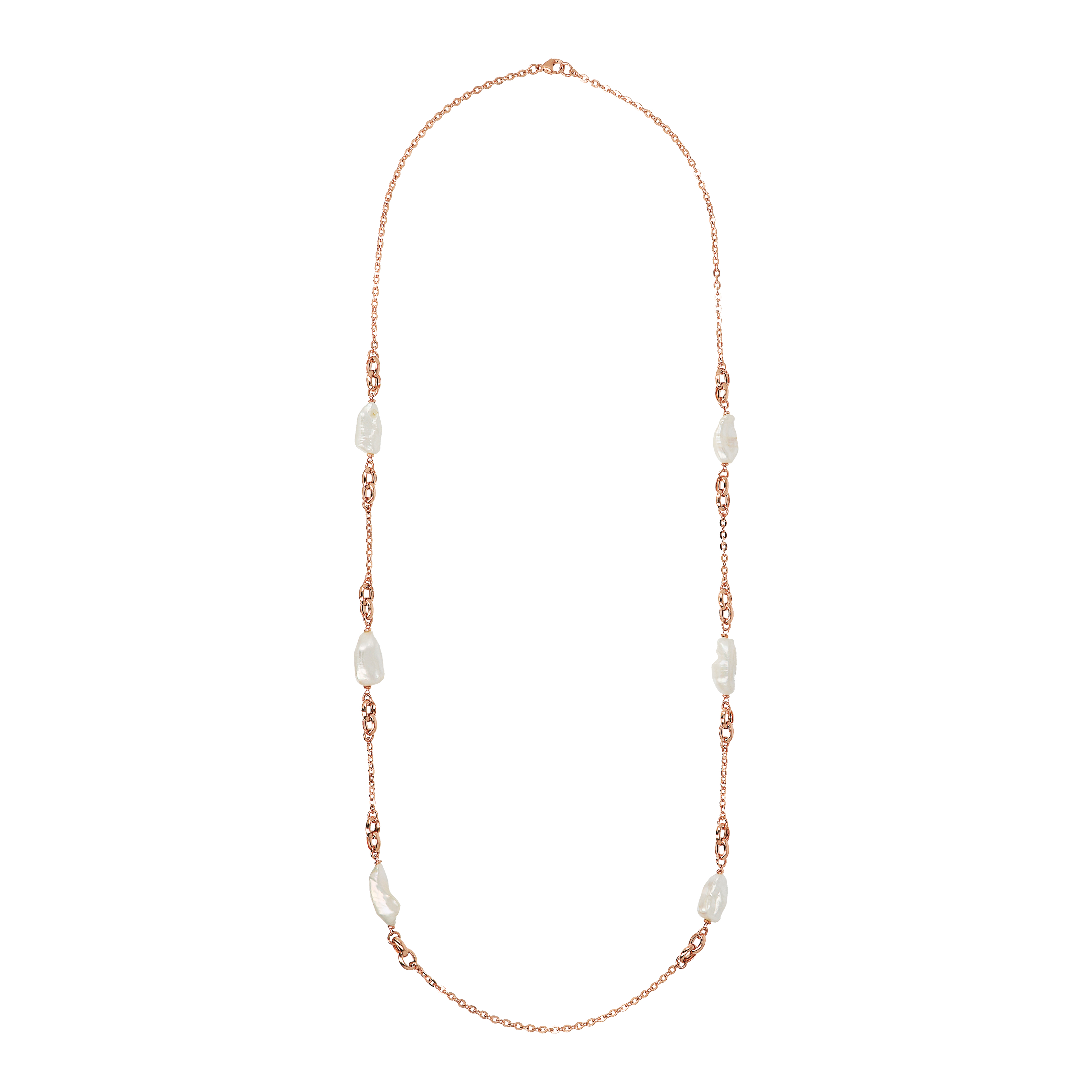 Collana lunga Bronzallure realizzata su base Golden Rosè, placcata oro rosa 18kt, con catena rolo impreziosita da station di concatenati e da sei perle Barocche coltivate d'acqua dolce bianche dalla forma irregolare