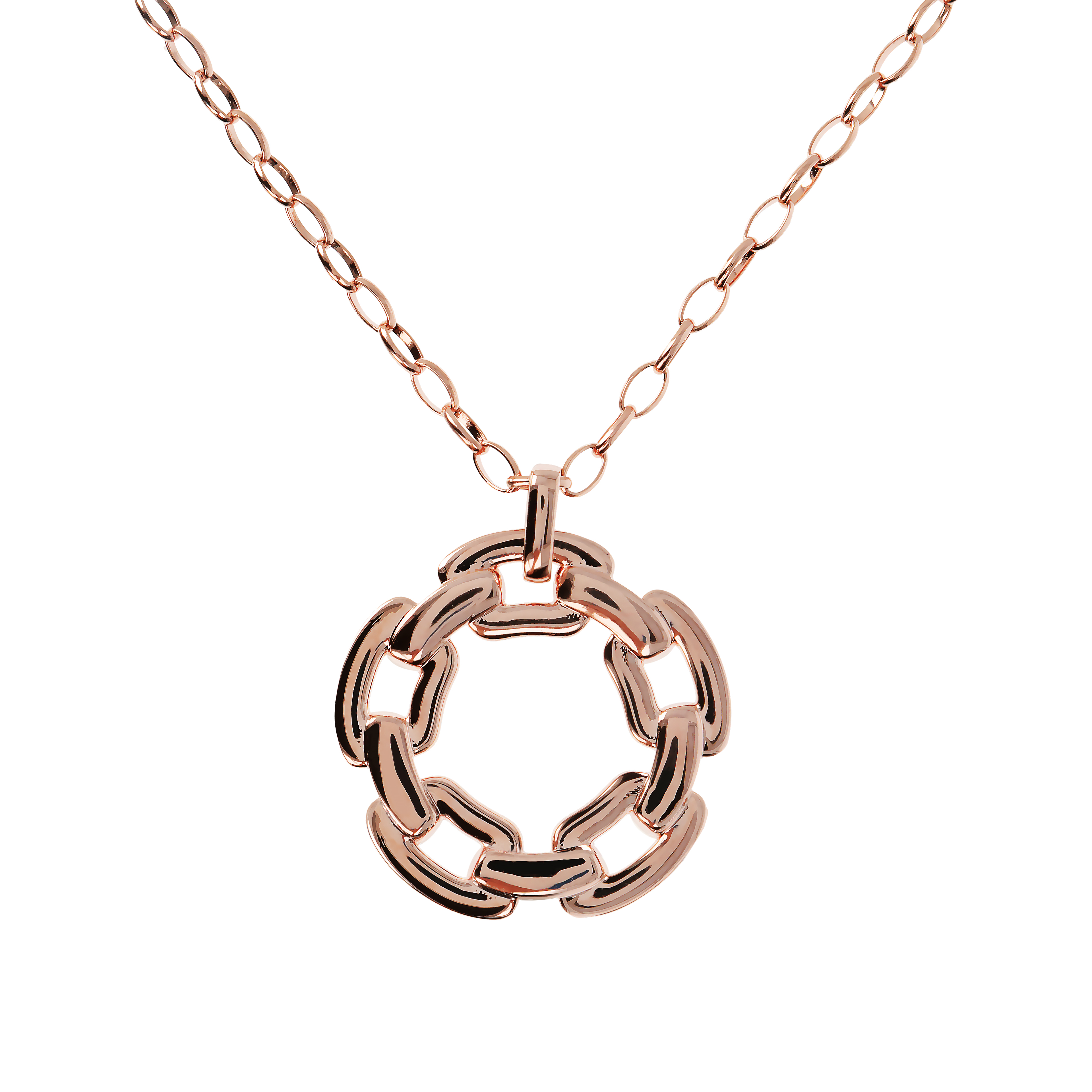 Collana Bronzallure realizzata in lega Golden Rosé, placcata oro rosa 18kt con catena rolo allungata e pendente tondo con maglie rettangolari; chiusura a moschettone.