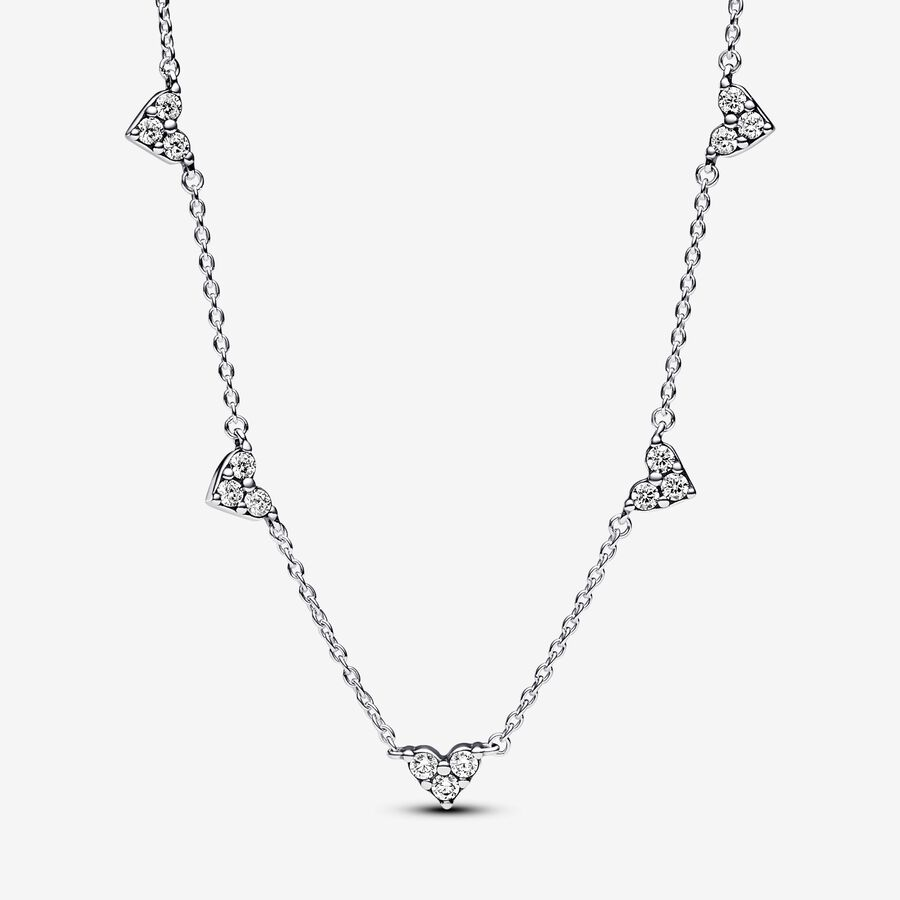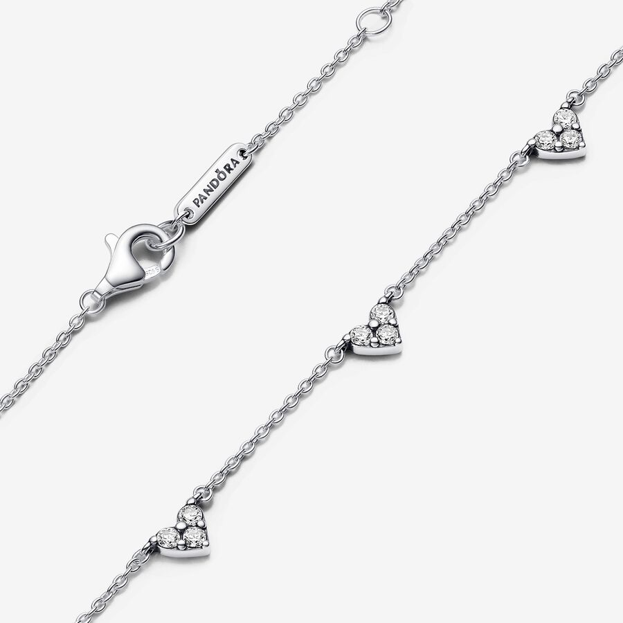 Incarna l'eleganza con la collana a catena Triple Stone Heart Station della nostra collezione Pandora Timeless. Realizzato in argento sterling, presenta cinque mini motivi a cuore con tre pietre fissati sulla catena, creando un look senza tempo con un tocco di emozione. La catena regolabile da 45 cm, con un discreto logo Pandora, garantisce una vestibilità perfetta. Con un motivo sentito e un delicato cenno alla bellezza dello scintillio, questa collana è un regalo ideale per occasioni speciali o un'aggiunta elegante alla tua collezione.