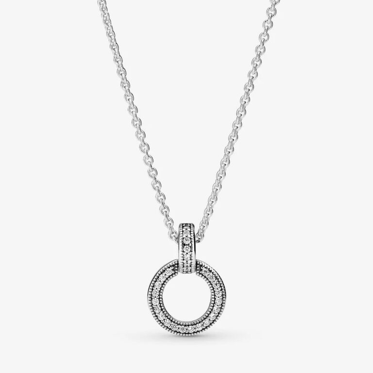 Attira ogni sguardo con questa collana e pendente Cerchio doppio. La collana, realizzata in Argento Sterling 925, presenta due cerchi che si fondono dando vita a un pendente. Il cerchio superiore include una fila di pietre di zirconia cubica incolori incastonate a pavé lungo il bordo e il logo Pandora su un lato. Il cerchio inferiore oscilla avanti e indietro partendo dal cerchio superiore e presenta un pavé di pietre di zirconia cubica incolori su un lato e cuori intagliati sull’altro. Gira la collana per cambiare volto al tuo look.