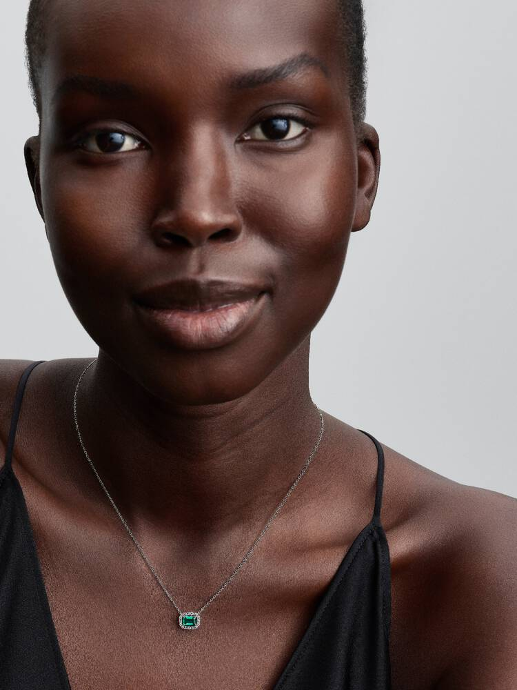 Immergiti nell’incanto del verde smeraldo. Decorata da una pietra centrale verde circondata da pavé su una catena in Argento Sterling 925, questa collana scenografica si ispira ai tesori nascosti nei portagioie di un tempo.
