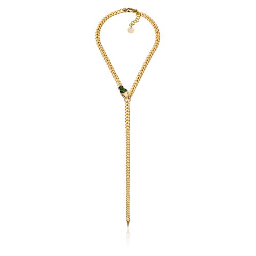 Collier di catena grumetta battuta in bronzo dorato con testa di serpente e finitura in smalto verde. Forme sinuose, movimento e volume irresistibile per una collana dal design unico ed ipnotico. Un gioiello luminoso e d'impatto che da solo costruisce un look e racconta un desiderio ardente.Chiusura: moschettone con adjust. Lunghezza: 43 cm.