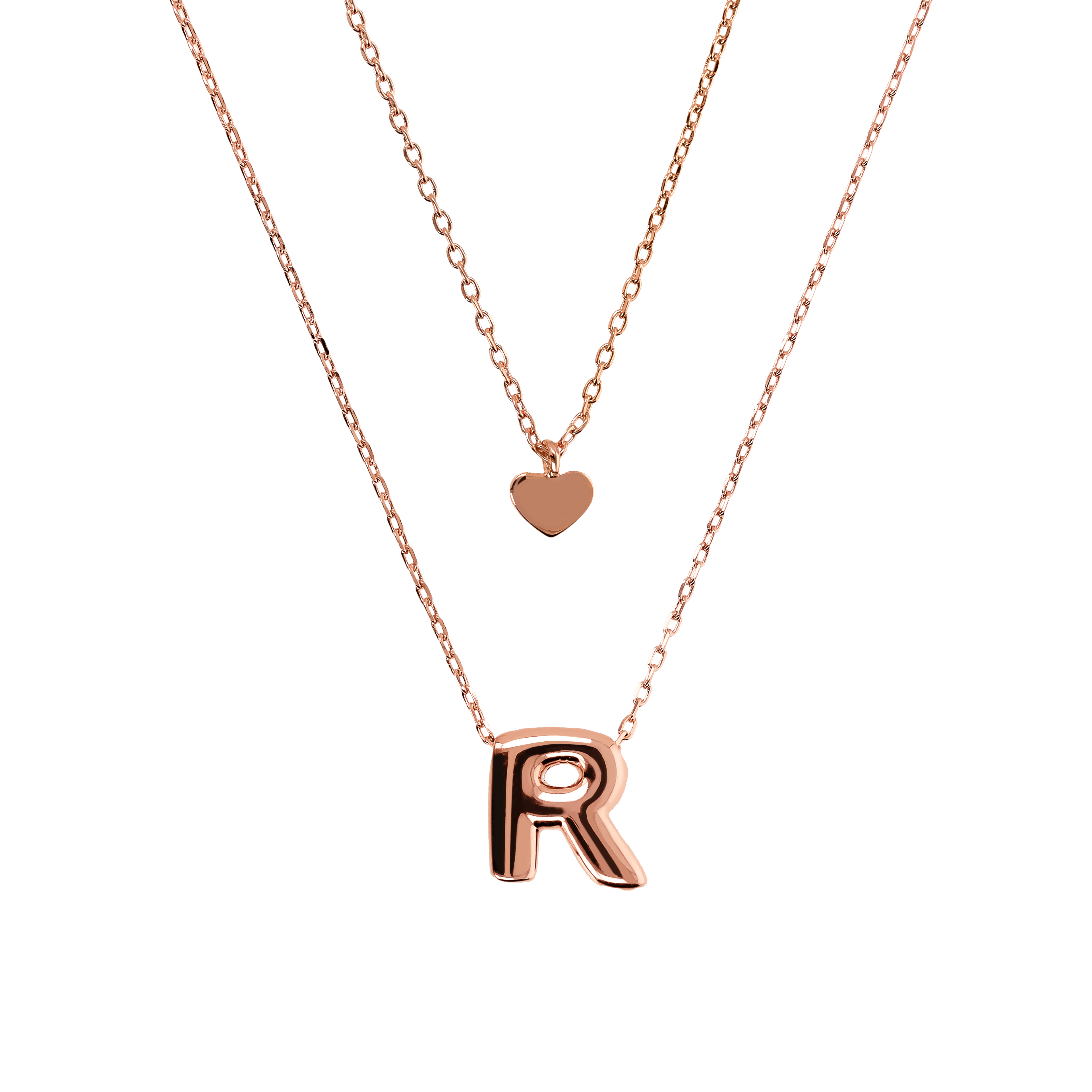 Collana graduata Bronzallure realizzata in lega Golden Rosè, placcata Oro rosa 18kt, con doppio filo di catena forzatina: sul filo più corto (39 cm)  presente un piccolo ciondolo cuore. Sul filo più lungo (45 cm)  presente un pendente con lettera. Chiusura a moschettone.