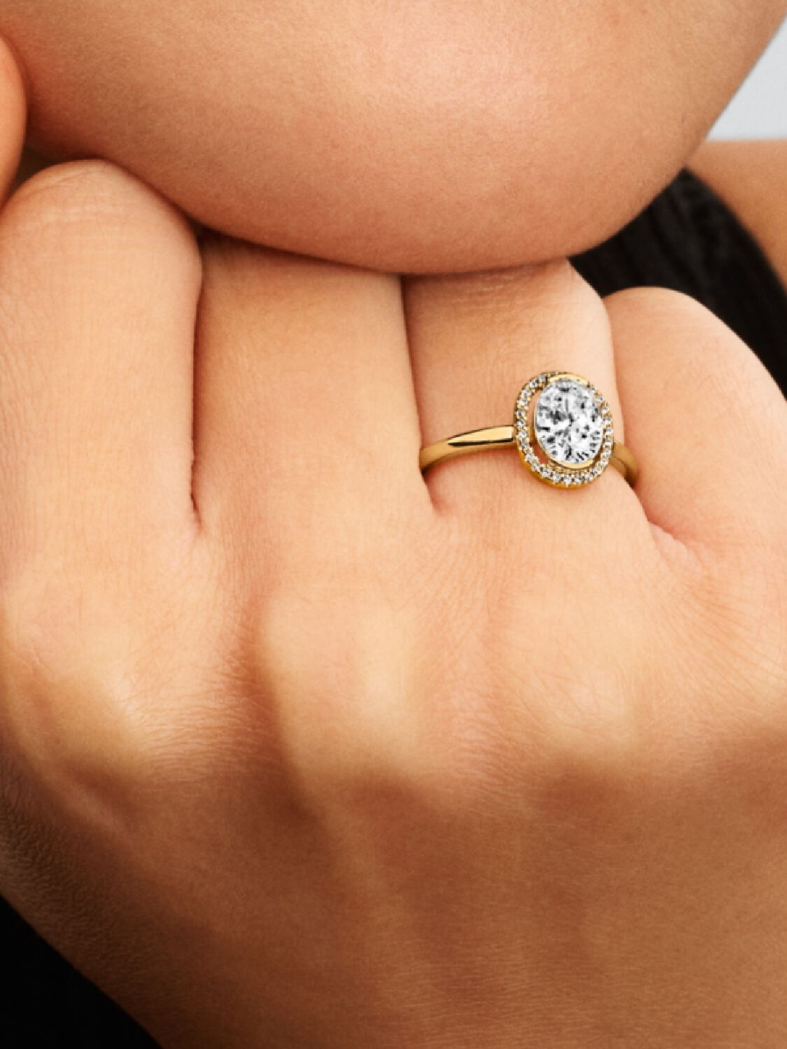 Crea un look luminoso con l'anello Punto Luce Ovale placcato Oro 14k. Con una pietra ovale rialzata circondata da pavé di zirconia cubica, è perfetto da solo o abbinato ad altri gioielli per uno stile elegante e senza tempo.