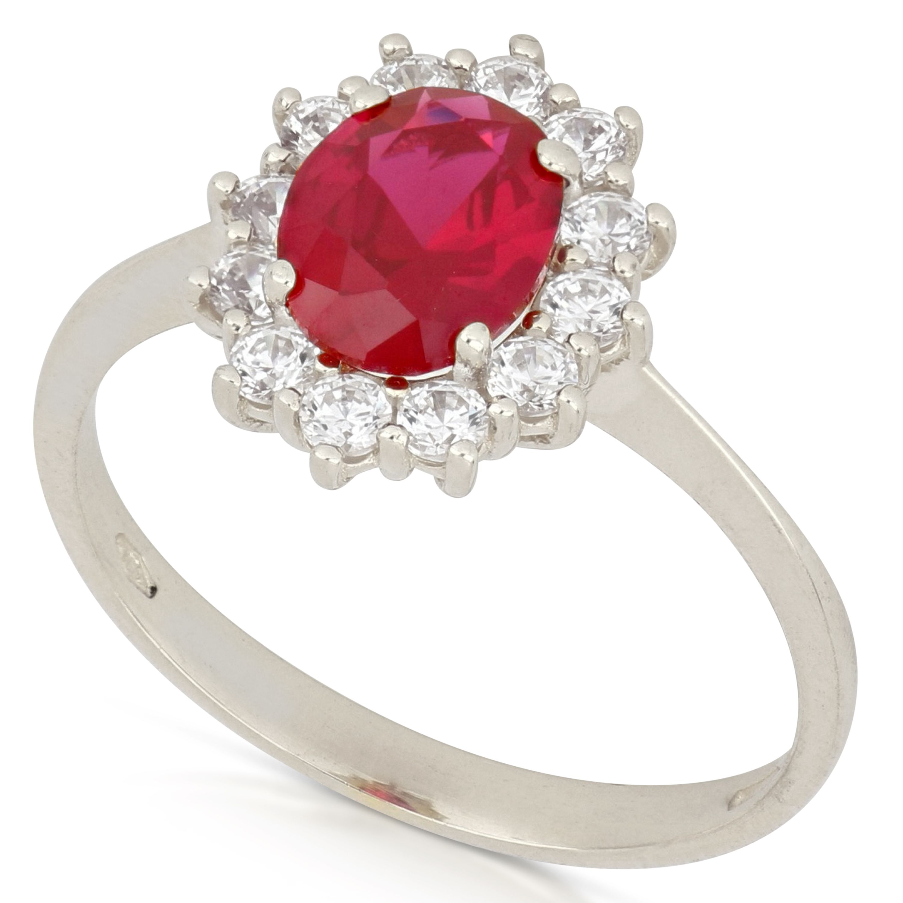 Lasciati conquistare dal raffinato design di questo anello artigianale in oro bianco 18kt, dal peso di circa 2,80 grammi. Il punto focale è una splendida pietra di colore rossa, avvolta da un elegante contorno di zirconi taglio brillante che ne valorizzano la brillantezza e ne esaltano il tono intenso.