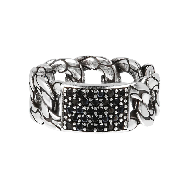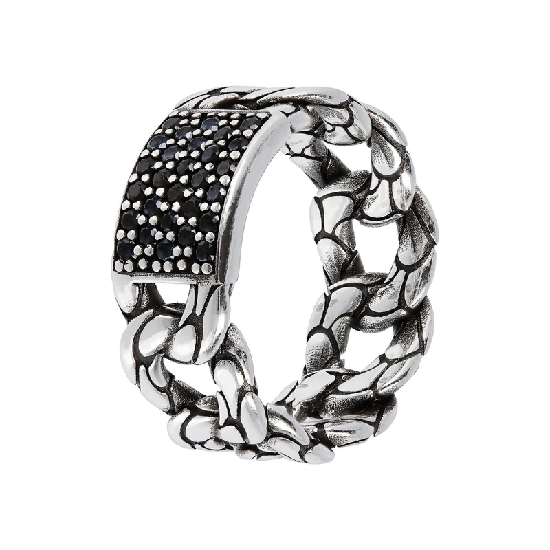 Anello a fascia uomo Albert M. realizzato su base di argento 925 impreziosito da una catena grumetta dalla texture sirena con placchetta rettangolare centrale ricoperta da pavè in pietra naturale spinello nero. Creazione dal design definito che può essere facilmente indossata con qualsiasi abito.