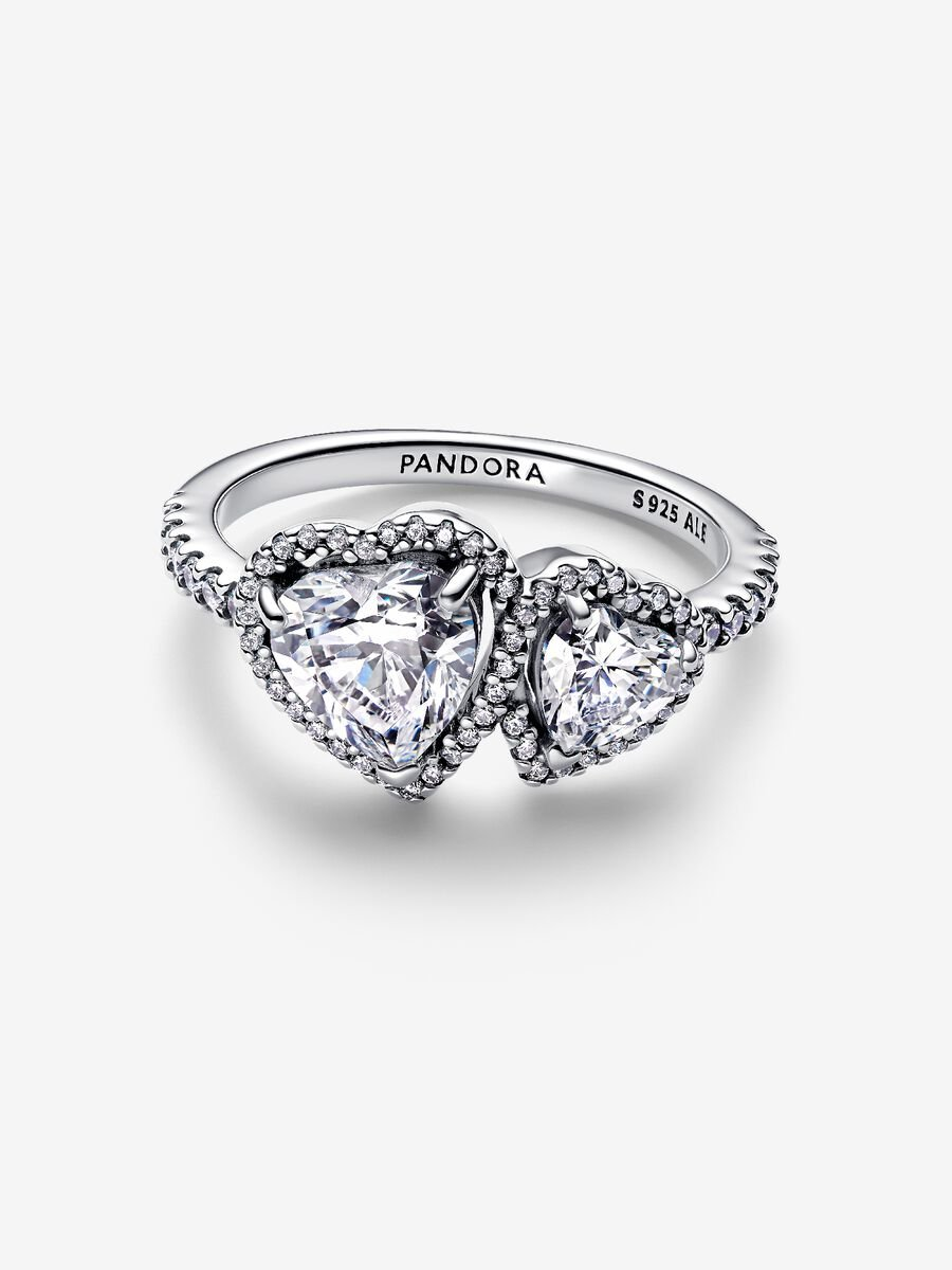 Questo anello in Argento Sterling 925 presenta due pietre di zirconia cubica incolore a forma di cuore collegate da un profilo di pavé che prosegue lungo la fascia per un ulteriore tocco di luminosità....