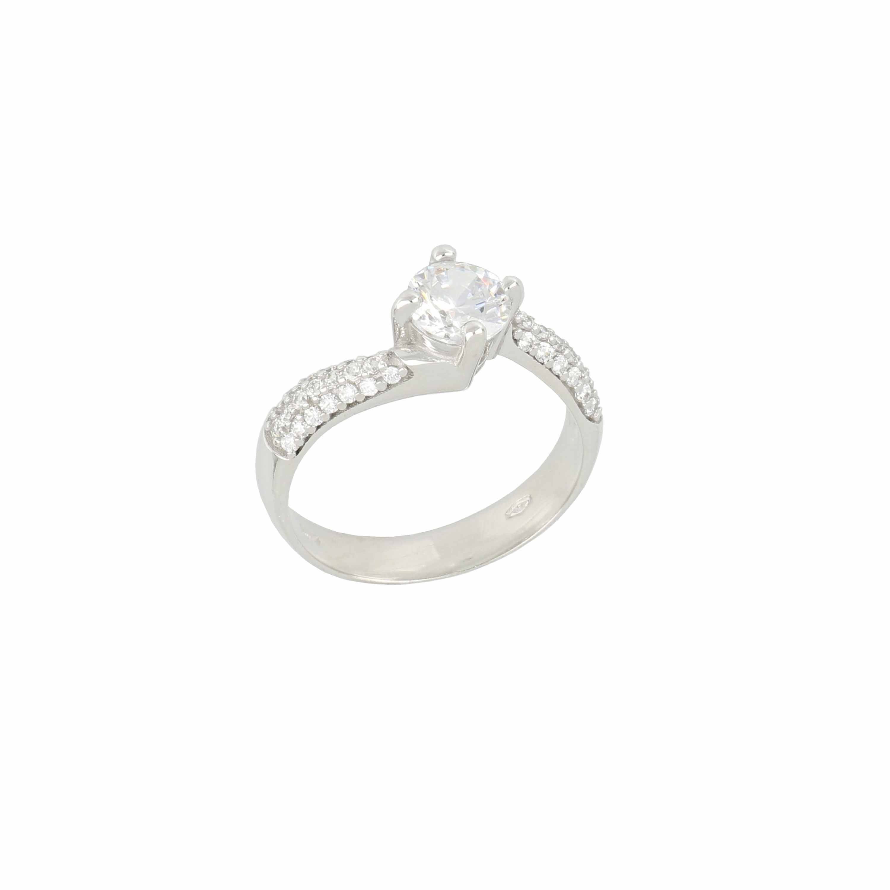 Aggiungi un tocco di luminosità al tuo look con questo raffinato anello solitario in oro bianco 18kt, dal peso di circa 3,85 grammi. Il suo design elegante presenta uno zircone centrale con taglio brillante, impreziosito da zirconi laterali che ne esaltano ulteriormente la brillantezza.
