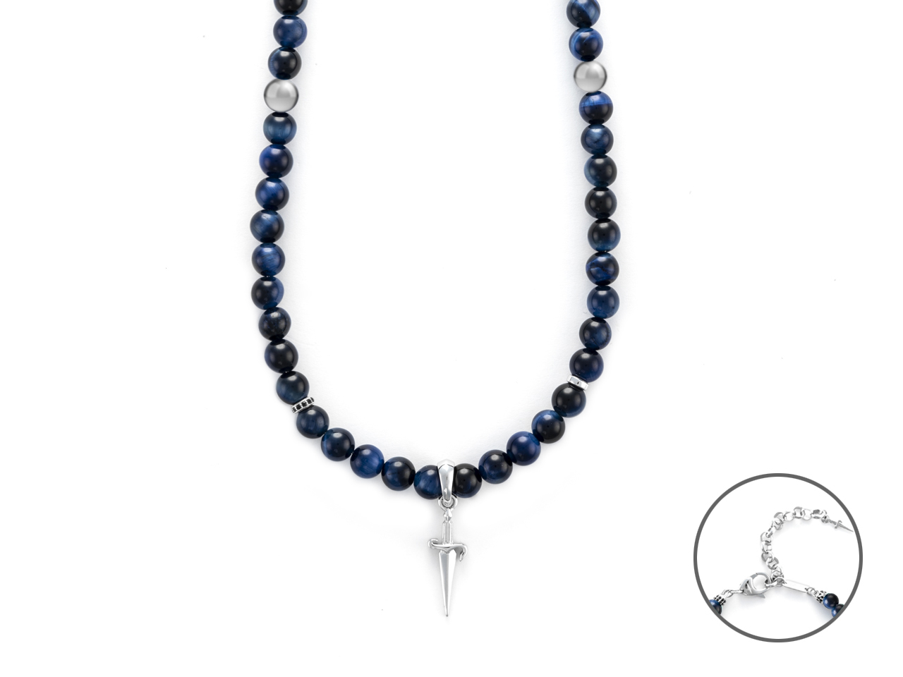 Collana Cesare Paciotti, referenza JPCL2424B , è realizzata in Argento 925, con pendente a forma di pugnale al centro di una serie di pietre occhio di tigre di colore blu