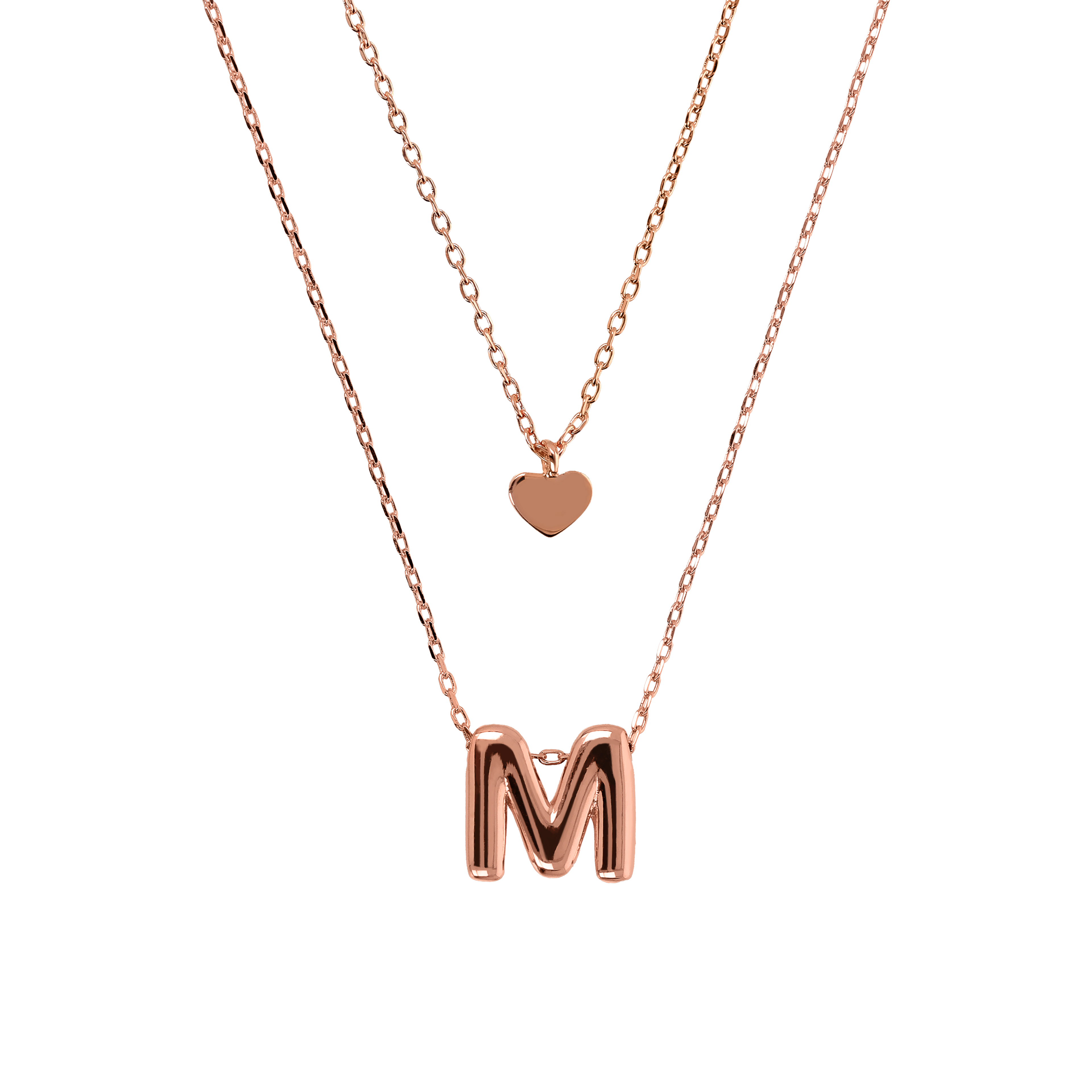 Collana graduata Bronzallure realizzata in lega Golden Rosè, placcata Oro rosa 18kt, con doppio filo di catena forzatina: sul filo più corto (39 cm) presente un piccolo ciondolo cuore. Sul filo più lungo (45 cm) presente un pendente con lettera. Chiusura a moschettone.