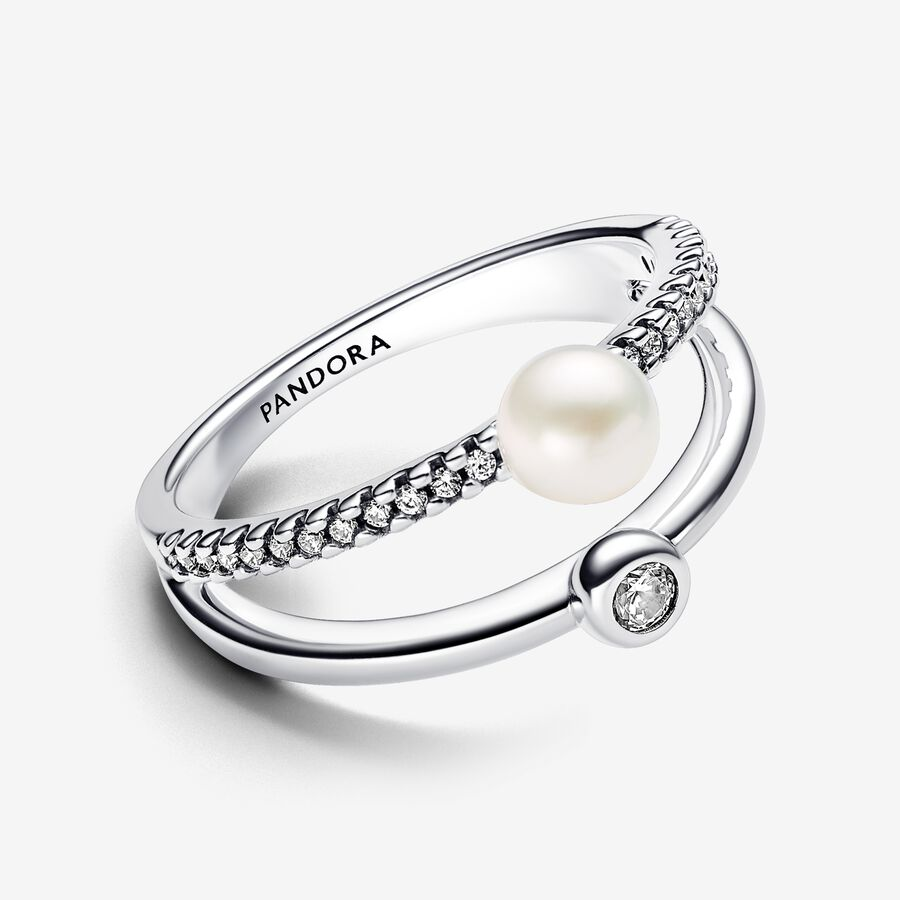Falli sembrare due volte con il nostro anello a doppia fascia con perle coltivate d'acqua dolce trattate e pavé della collezione Pandora Timeless. Realizzato in argento sterling, presenta una perla coltivata...