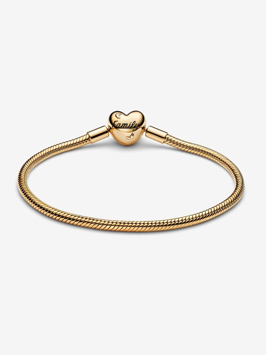Simbolo dei legami eterni, questo bracciale placcato in Oro 14k presenta l'iconica maglia snake e una chiusura a cuore con lavorazione openwork che raffigura l'albero della famiglia. Con la scritta "Family" (Famiglia) in smalto nero sul retro della chiusura, è perfetto per celebrare le tue radici.