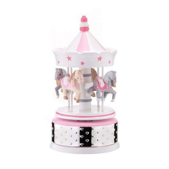 SOVRANI - GIOSTRA CARILLON H 20 - W5221RA Sovrani Carillon giostra bimba cavalli con cuori in legno e resina rivestita in argento. Dettagli color rosa. Altezza 20 cm. La referenza è W5221 RA