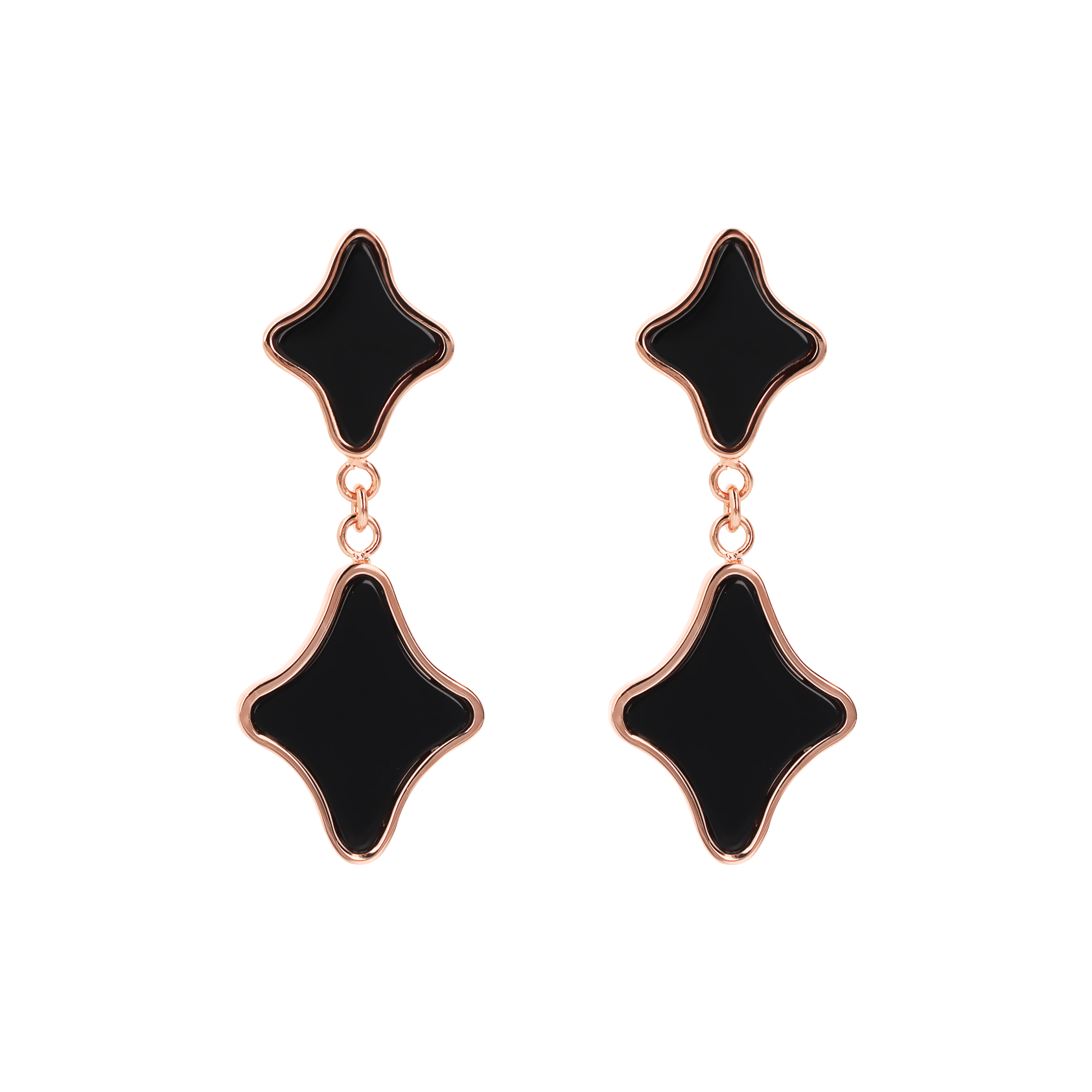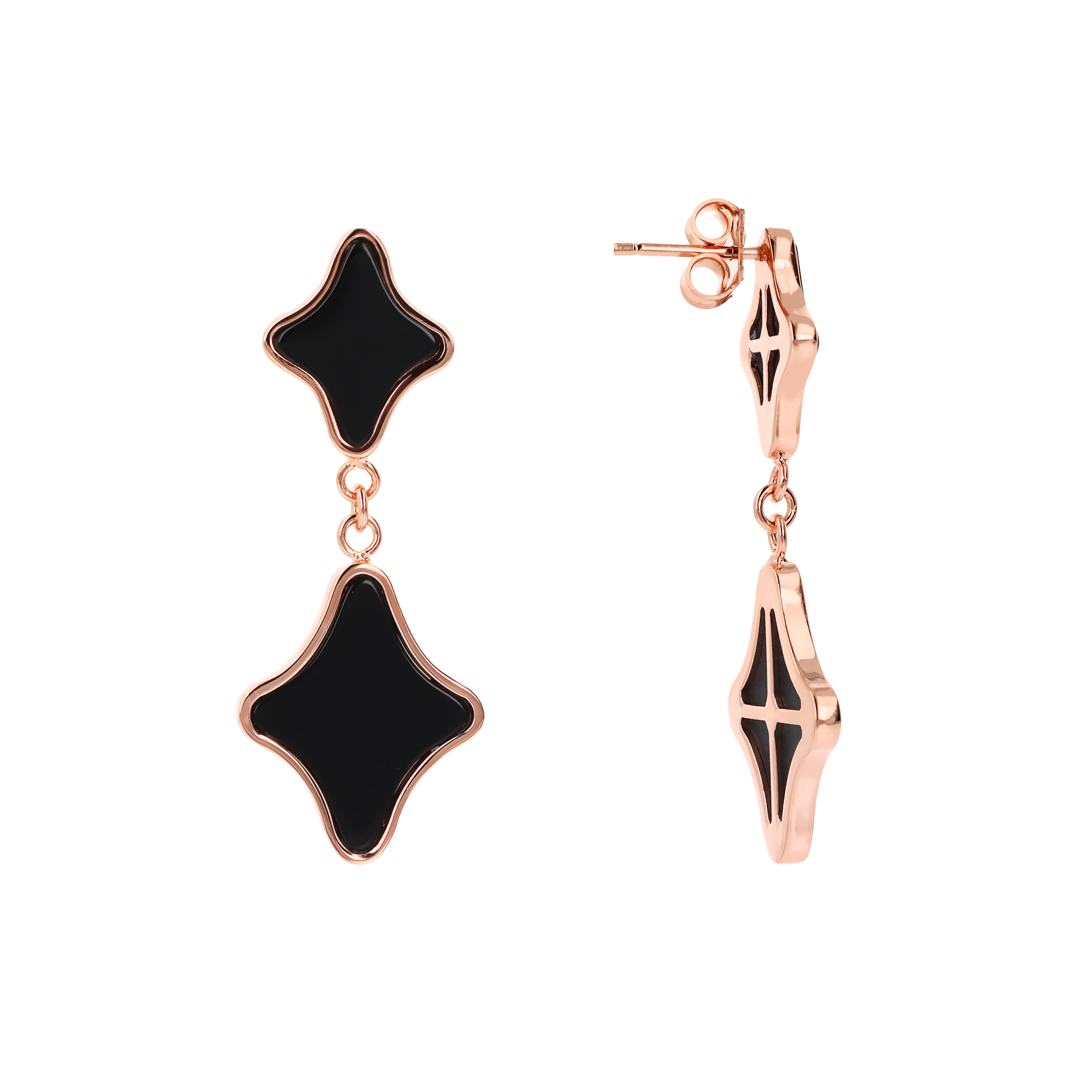 Orecchini pendenti Bronzallure realizzati in lega Golden Rosè, placcata oro rosa 18kt, impreziositi da due elementi ètoile, uno piccolo (14.5x11.5 mm) e uno grande (19.5x15.5 mm) realizzati in pietra naturale onice nero o madreperla bianca