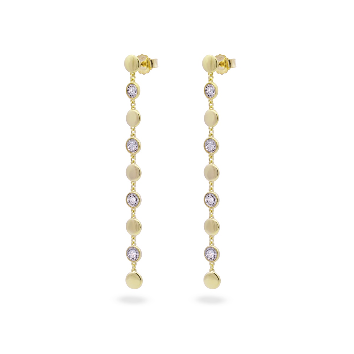 Orecchini pendenti con cerchi in pavè alternati a cerchi lisci bombati.