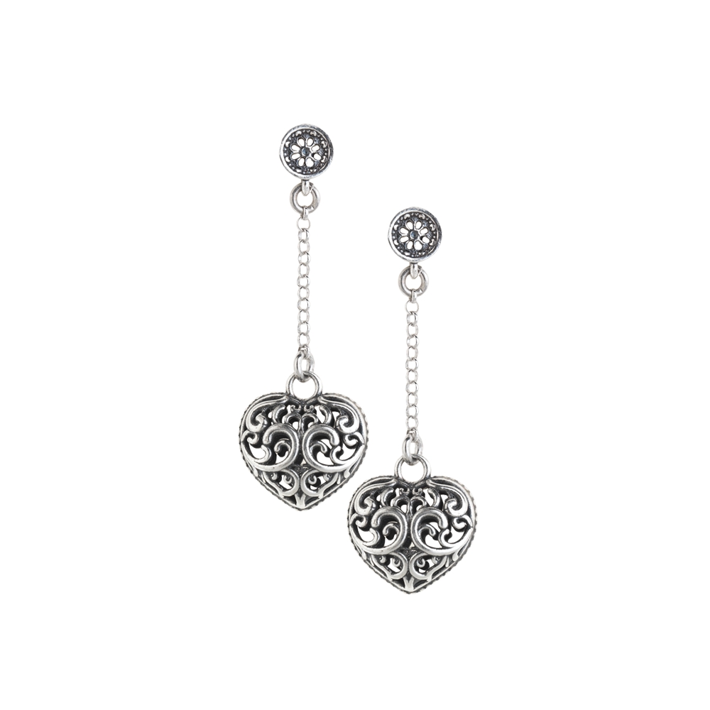 Collezione Cuori. Preparati per una serata all'insegna dell'amore, fai risplendere il tuo viso di gioia. Cura per ogni dettaglio rifiniti a mano in argento brunito. Altezza: 4,5 cm