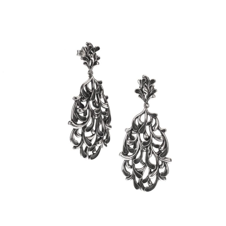 Collezione Rugiada. Espressione di vita e natura da portare con sé, forme leggere ma decise. Cura per ogni dettaglio rifiniti a mano in argento brunito. Altezza: 5 cm
