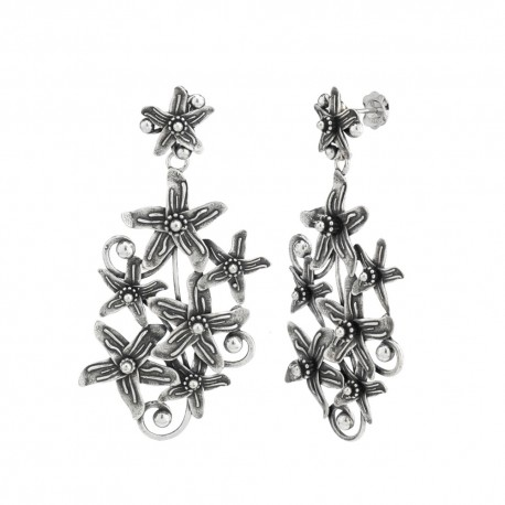 Gli Orecchini pendenti, Collezione Zagara, sono realizzati in argento 925, con dettagli bruniti curati a mano, a forma di fiore di zagara. Lunghezza Orecchini 7 cm. Chiusura con Farfallina.