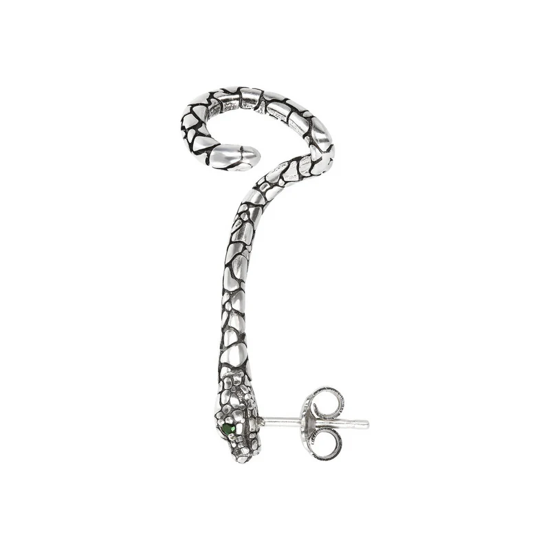 Orecchino singolo climber Albert M. realizzato su base di Argento 925 dal design serpente i cui occhi sono realizzati con pietra naturale agata verde. Chiusura a perno e farfalla. Lunghezza di 3.7...