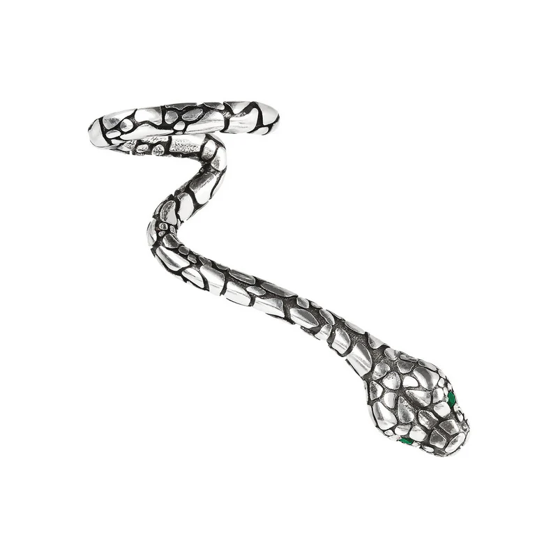 Orecchino singolo climber Albert M. realizzato su base di Argento 925 dal design serpente i cui occhi sono realizzati con pietra naturale agata verde. Chiusura a perno e farfalla. Lunghezza di 3.7 cm. La particolare texture dona una nota sensuale e misteriosa a questa creazione.