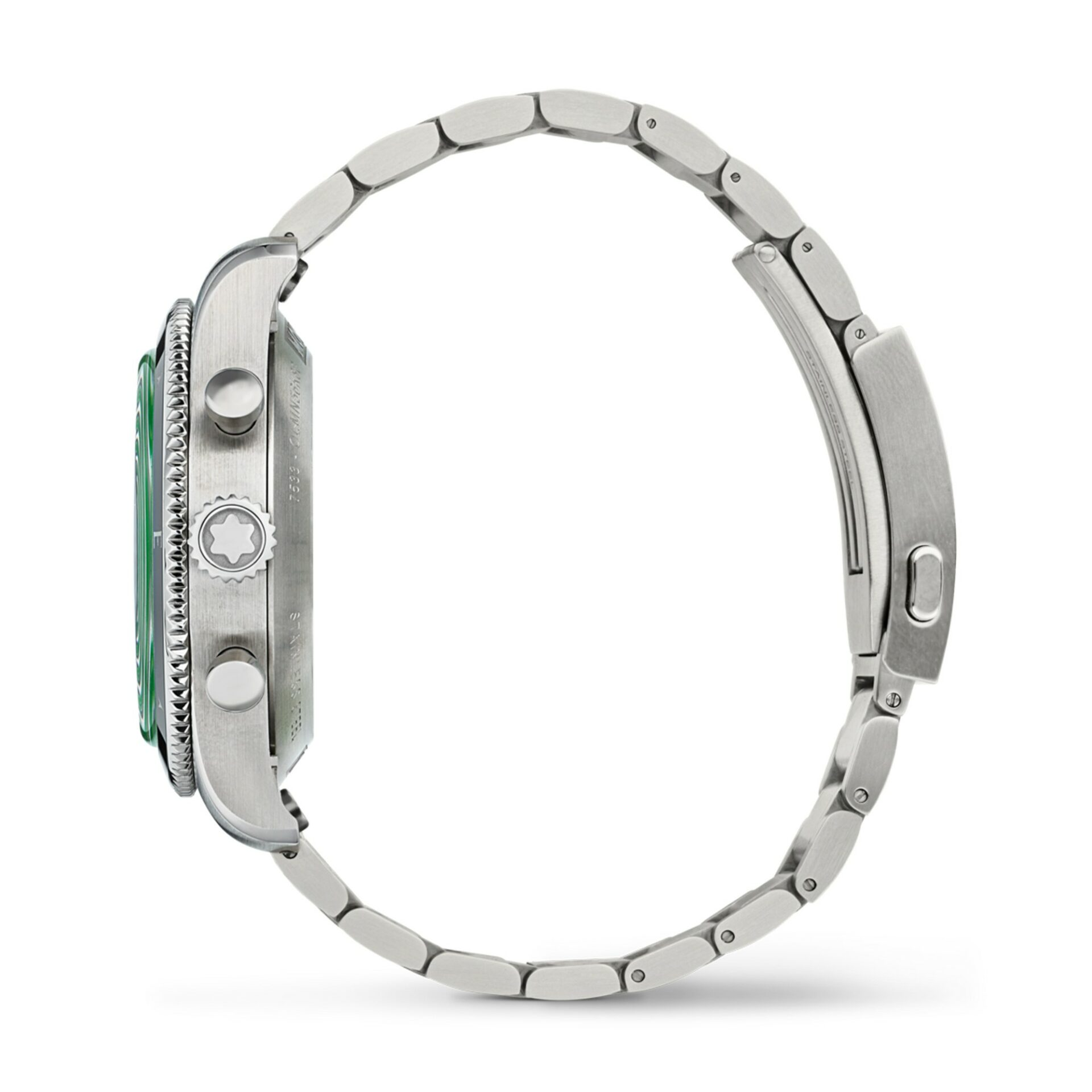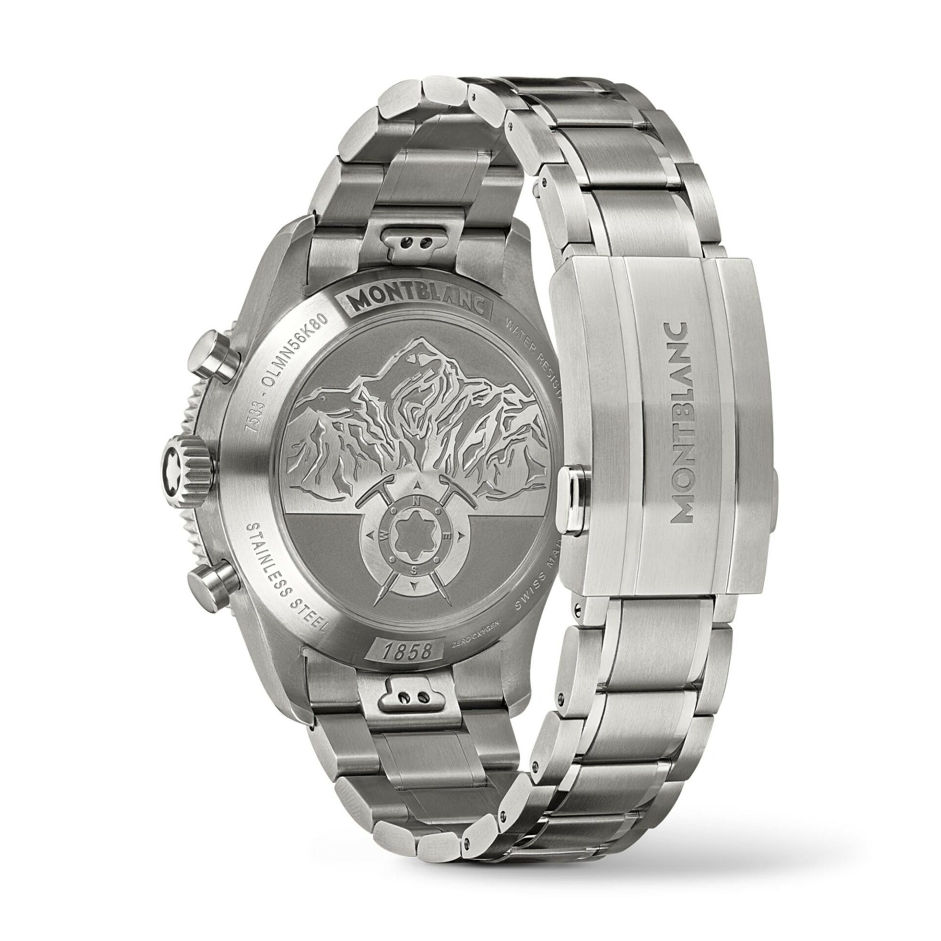 Espressione dello spirito delle esplorazioni montane e della bellezza dei paesaggi ghiacciati antartici, il quadrante verde Sfumato motivo “ghiacciaio” del Montblanc 1858 Automatic Chronograph 0 Oxygen si ispira al verde intenso degli iceberg color smeraldo o giada. Il segnatempo è custodito in una cassa da 42 mm in acciaio pregiato totalmente priva di ossigeno. Il quadrante è impreziosito da una configurazione cronografo bi-compax con indicatore dei piccoli secondi nero a ore 9 e contatore cronografico dei 30 minuti nero a ore 3. Coordinato con i quadranti secondari, questo segnatempo è dotato di una lunetta bidirezionale in ceramica nera con punti cardinali luminescenti. Il modello è dotato di un bracciale intercambiabile in acciaio pregiato con conicità e regolazioni raffinate e un fondello con l’incisione speciale “Spirit of Exploration”.