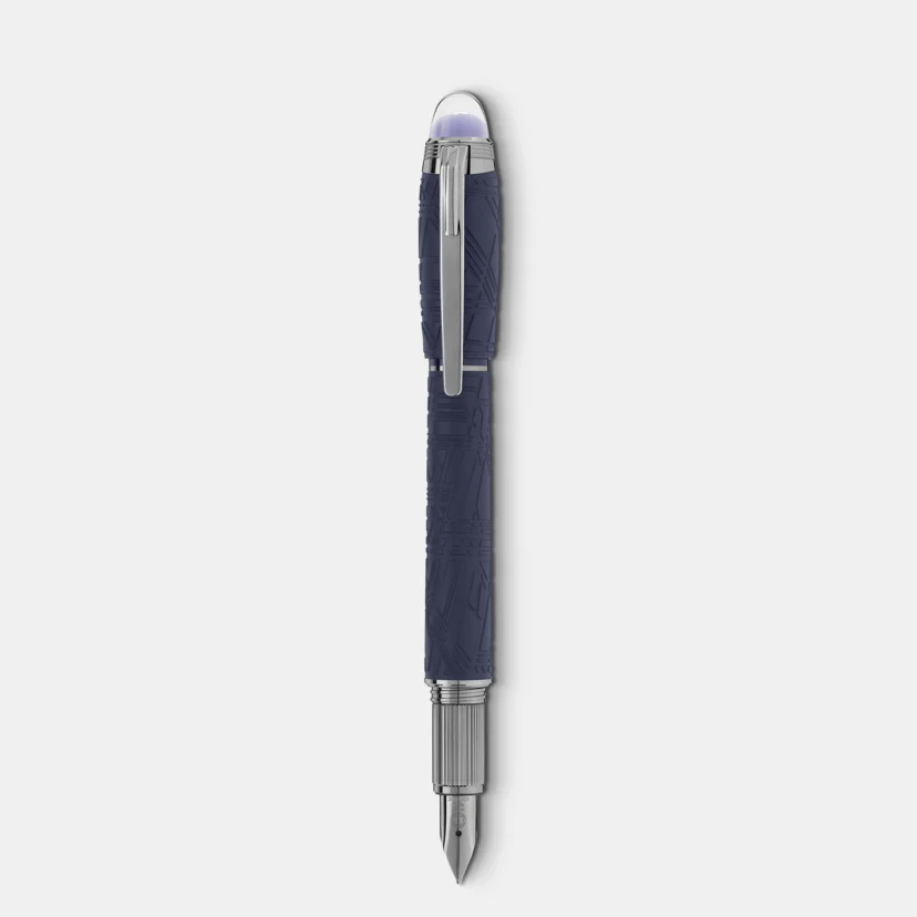 Starwalker SpaceBlue si spinge oltre il Pianeta Terra per rivolgere lo sguardo verso le stelle e la galassia. Decisamente maschile e futuristica, questa nuova collezione StarWalker presenta un nuovo look per il corpo e il cappuccio in resina, con un design che ricorda i motivi complessi della Struttura di Widmanstätten, una delle creazioni più ipnotiche della natura. Tutte le parti in metallo presentano una finitura rutenio scuro, mentre la pregiata resina opaca è di un intenso colore blu spazio, che richiama le tonalità di un cielo stellato. Anche la cupoletta sulla parte superiore del cappuccio, nella quale fluttua l’emblema Montblanc, ha un intenso colore blu spazio. La stilografica è realizzata a mano con un pennino in oro Au585 finitura rutenio.