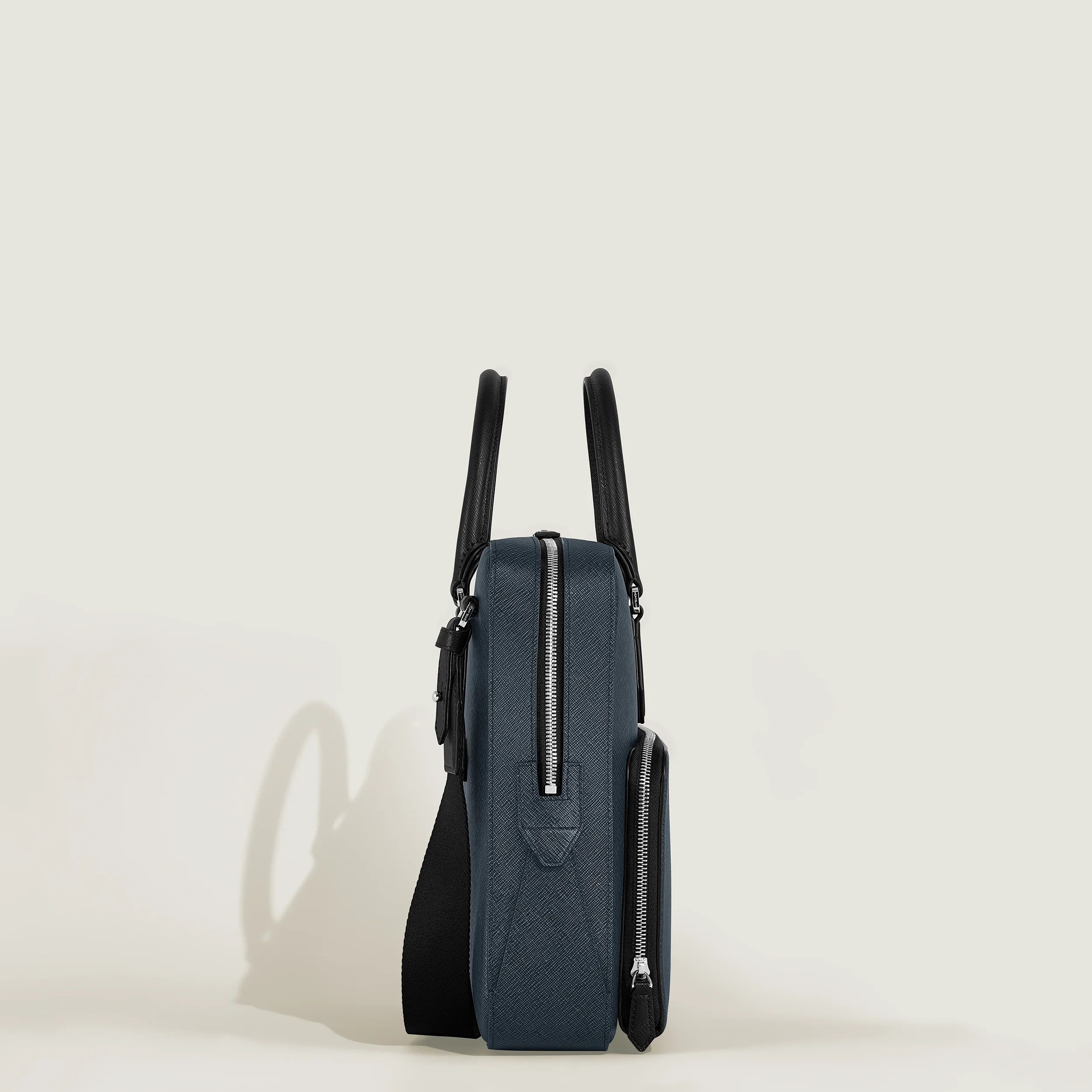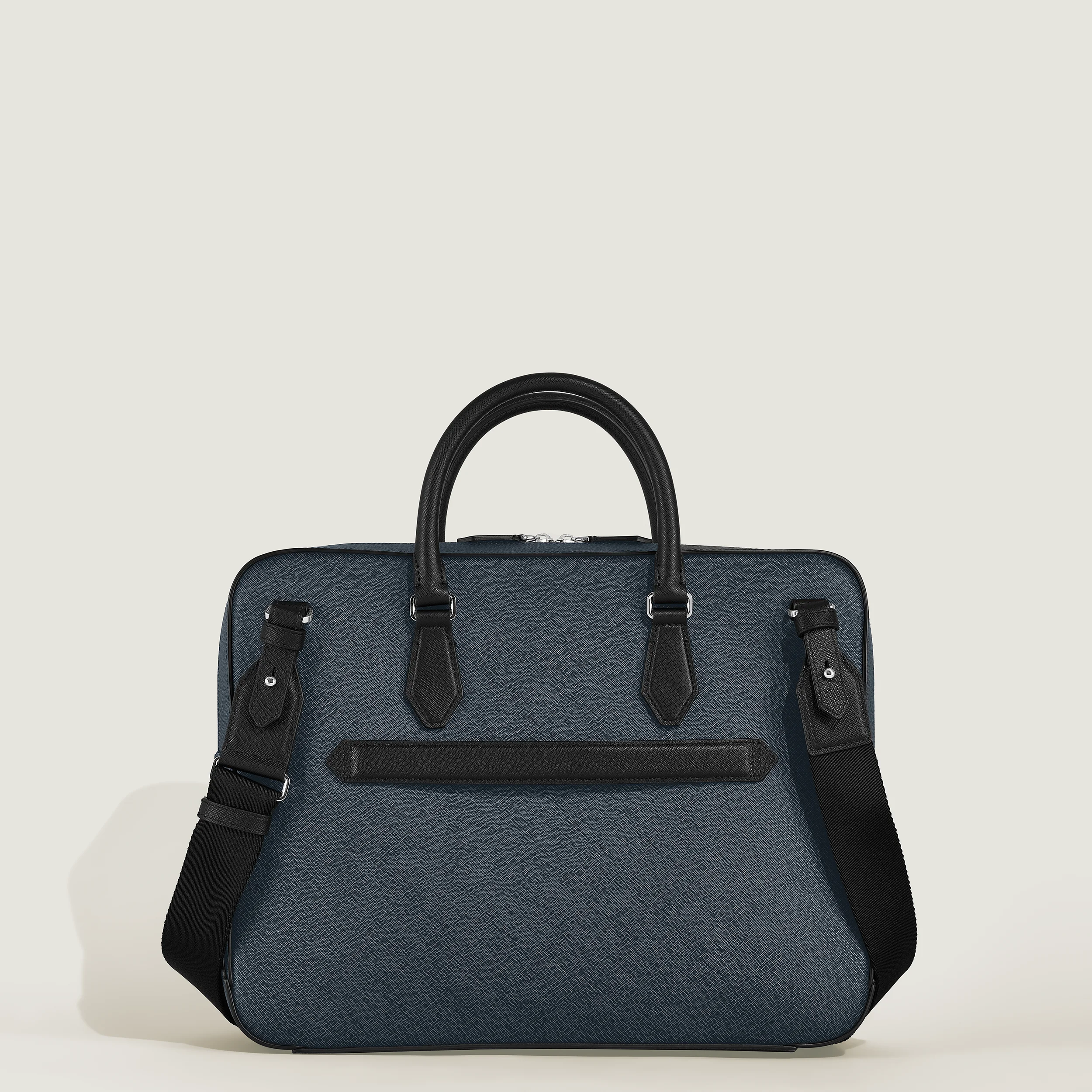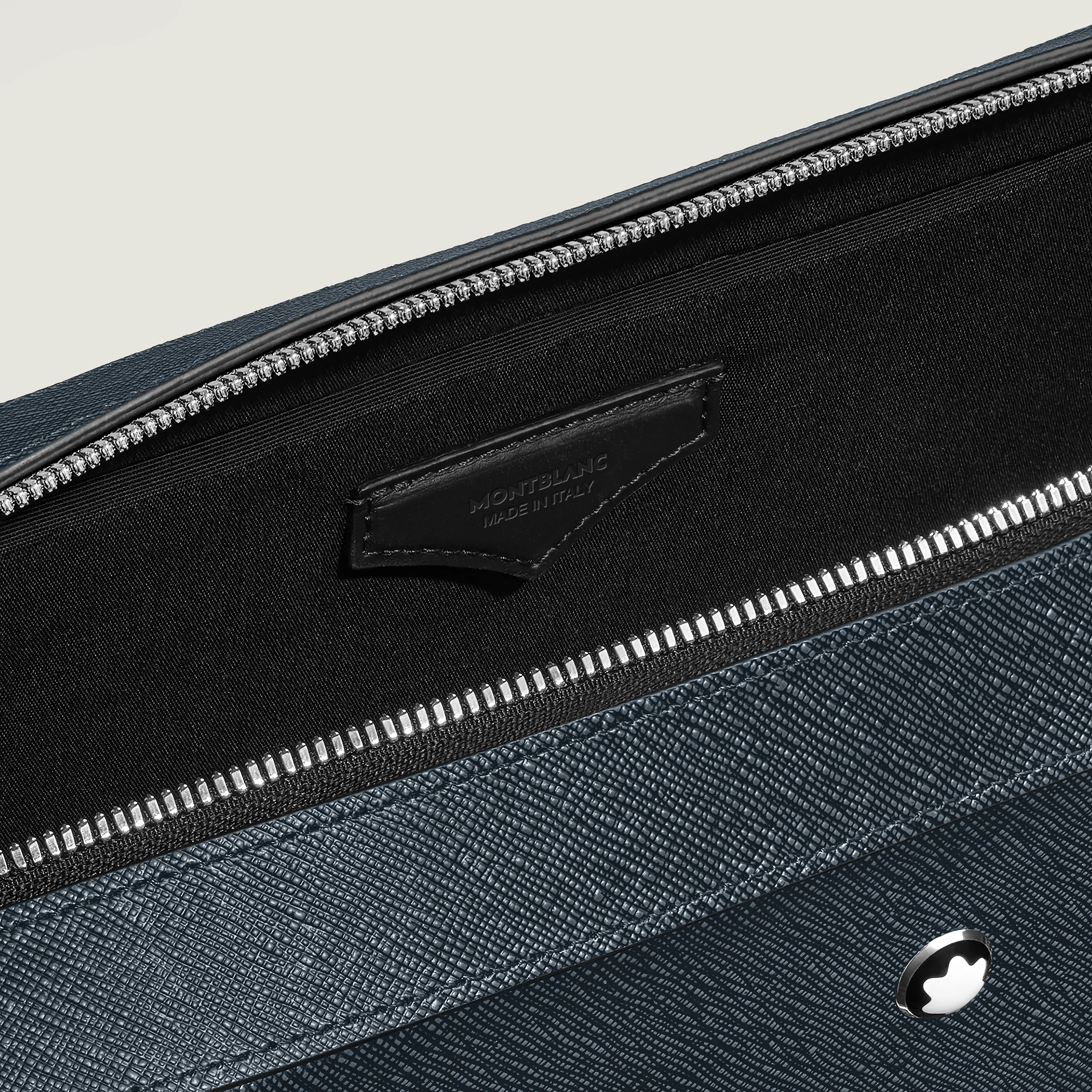 Questa elegante valigetta è dotata di un ampio scomparto principale per trasportare con stile documenti A4, laptop fino a 13 pollici, dispositivi elettronici e altri oggetti professionali. Realizzata in pelle Sartorial goffrata bicolore, nera e blu, è progettata con cura per le esigenze aziendali. Gli strumenti di scrittura possono essere riposti negli appositi passanti, mentre altri oggetti possono essere riposti in sicurezza in una tasca con cerniera o nelle due tasche aperte aggiuntive.