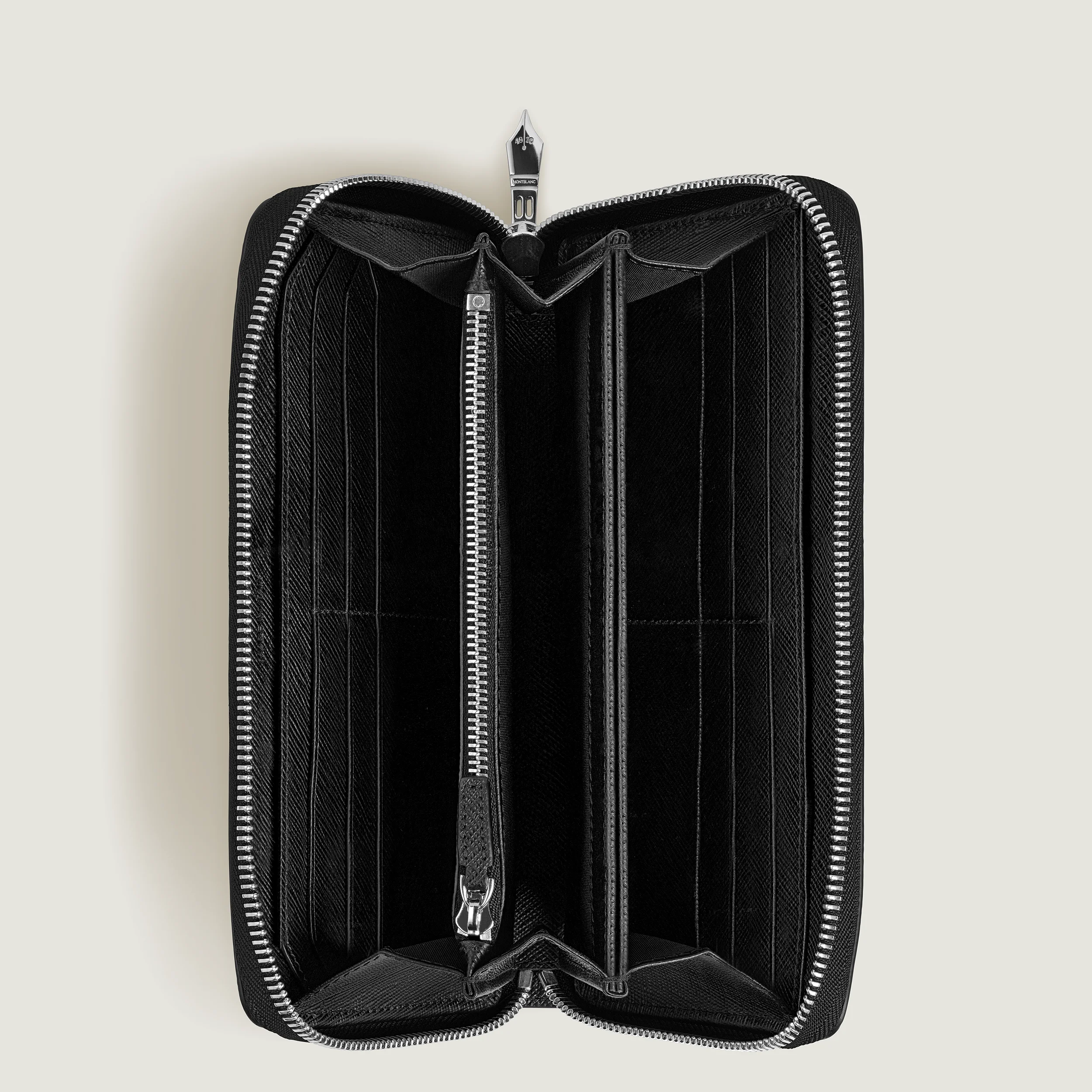 Realizzato in pelle Sartorial goffrata nera classica, questo portafoglio abbina funzionalità e design raffinato. Il distintivo cursore della cerniera a forma di pennino omaggia la tradizione della scrittura di Montblanc. All’interno, il portafoglio offre aperture per fino a 12 carte di credito, tre scomparti per banconote, un portamonete con cerniera sicuro e tre tasche aggiuntive per effetti personali piccoli.