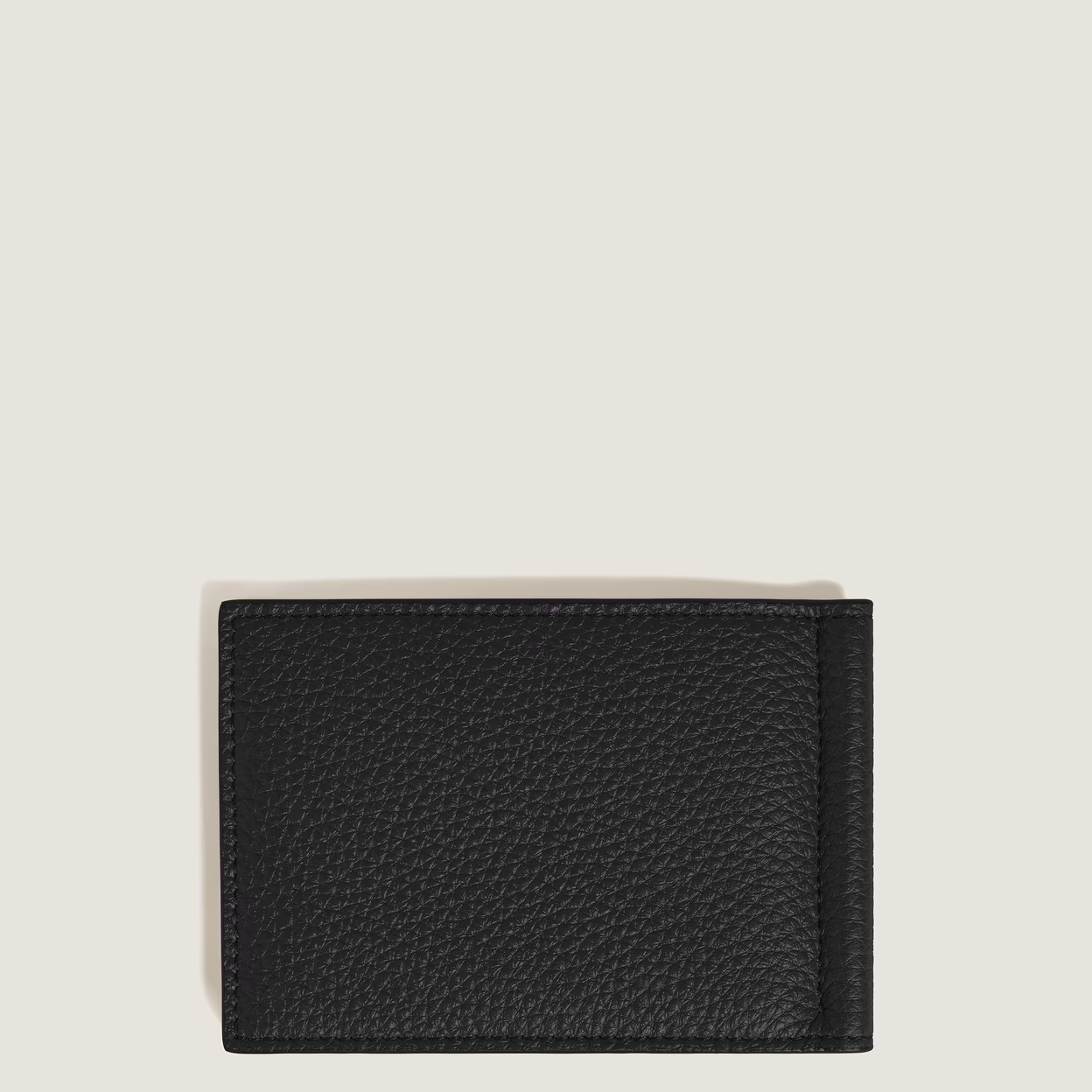 Questo portafoglio bi-fold sottile reinventa un modello tradizionale apportando un tocco di classe. Realizzato in lussuosa pelle granulata nera, presenta un elegante fermasoldi in metallo e sei aperture per carte di credito per un’organizzazione quotidiana all’insegna della ricercatezza perfetta per i più esigenti.