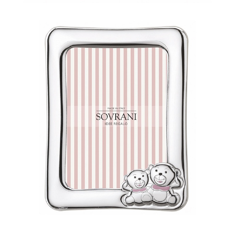 SOVRANI - PORTAFOTO DUE ORSETTI 9X13 - W5174RA Cornice da bimba Sovrani Argenti. Portafoto in argento laminato con raffigurati 2 orsetti di colore silver con finiture di colore rosa. La parte posteriore della cornice è in legno di colore bianco. Una cornice per conservare nel modo più dolce i momenti speciali del tuo bambino. Misura 9x13. La referenza è W5174RA