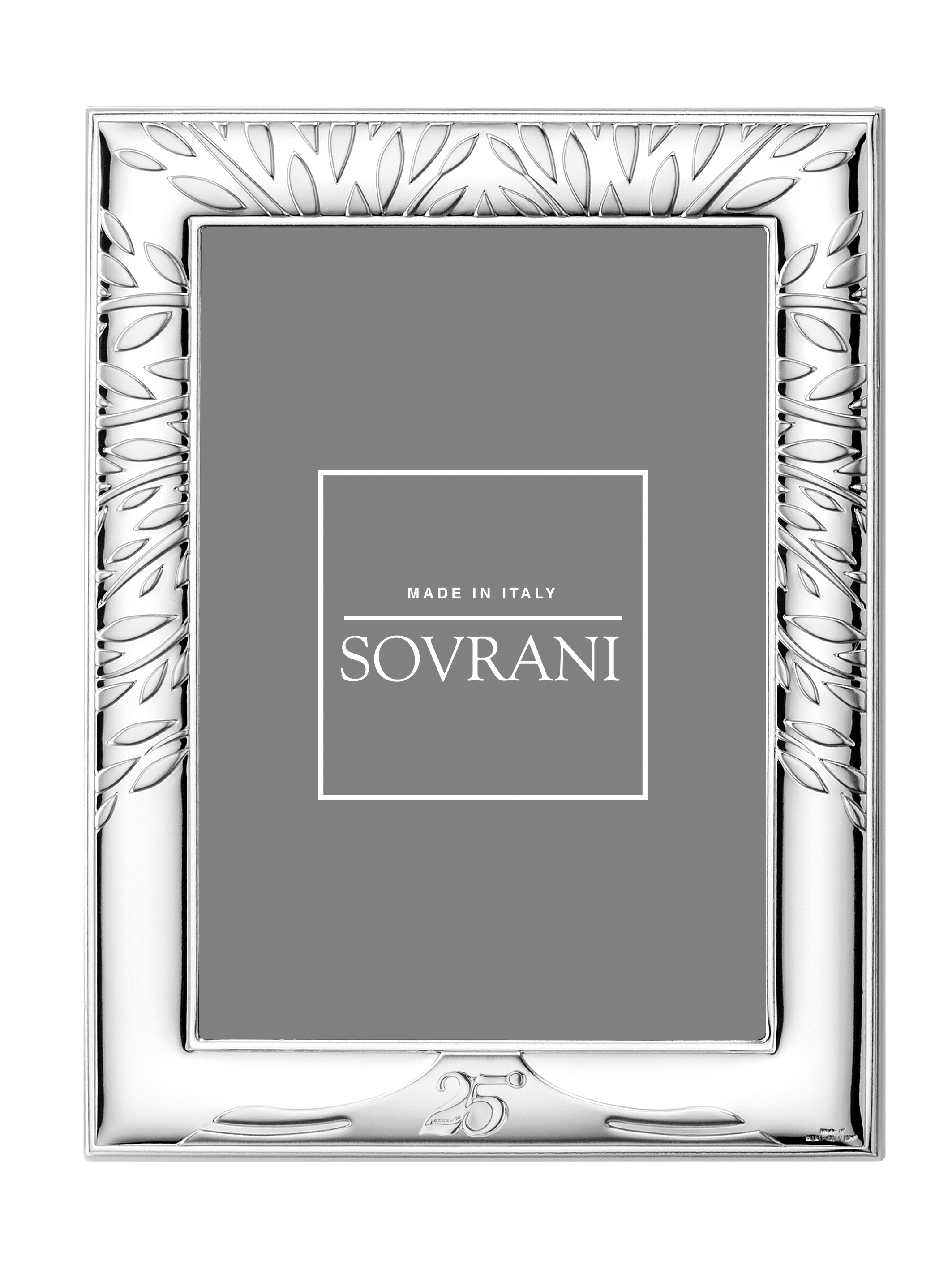 SOVRANI - PORTAFOTO FASCIA STRETTA ALBERO DELLA VITA 25° 13X18 - W684 Cornice in Argento bilaminato satinato, lucido con elegante lavorazione con "albero della vita" e con retro in legno. Cornice con 25, indicata per anniversario 25 anni di matrimonio. Misura interna per foto 13 x 18. La referenza è W684