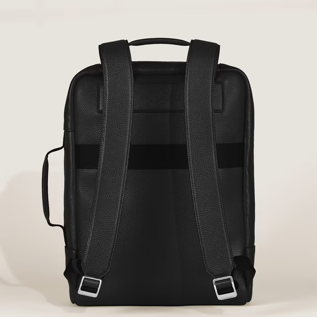 Realizzato in pelle con grana nera, questo zaino rettangolare unisce sofisticazione e praticità quotidiana. La sua costruzione pulita include una tasca anteriore con cerniera di rapido accesso, mentre un compartimento principale presenta una sezione imbottita per computer portatili (fino a 13”), una tasca aperta e due passanti per strumenti da scrittura; ideale per gli spostamenti di tutti i giorni e i brevi viaggi di lavoro. Un sistema satellite offre diverse opzioni per portarlo, come ad esempio agganciarlo a bagagli con ruote.